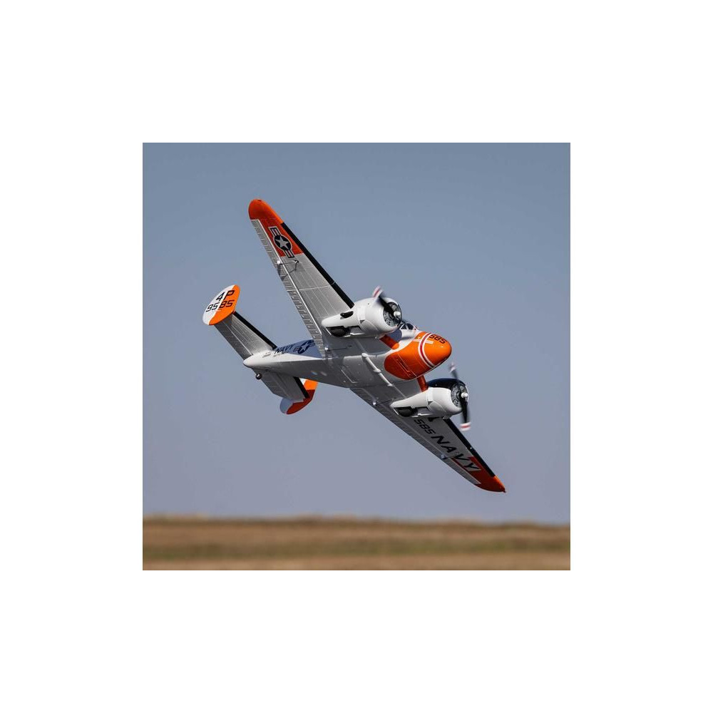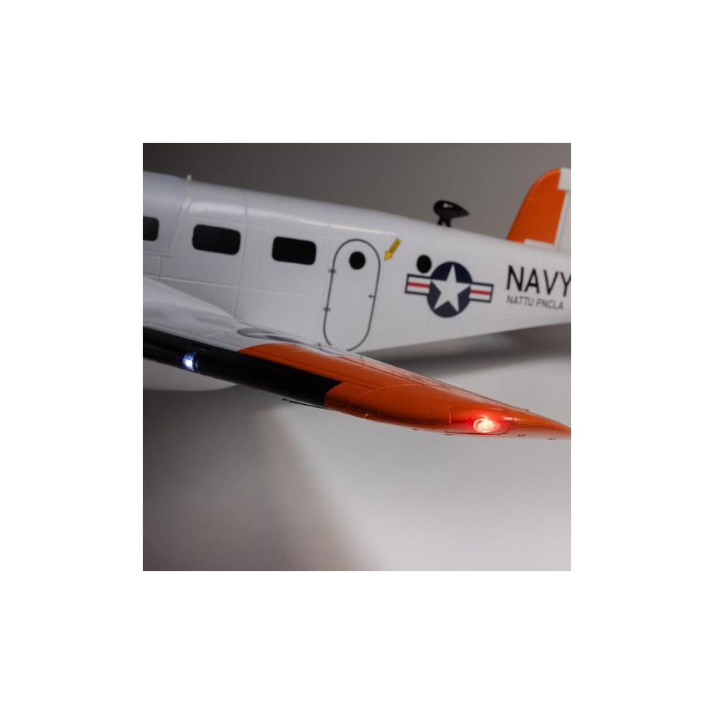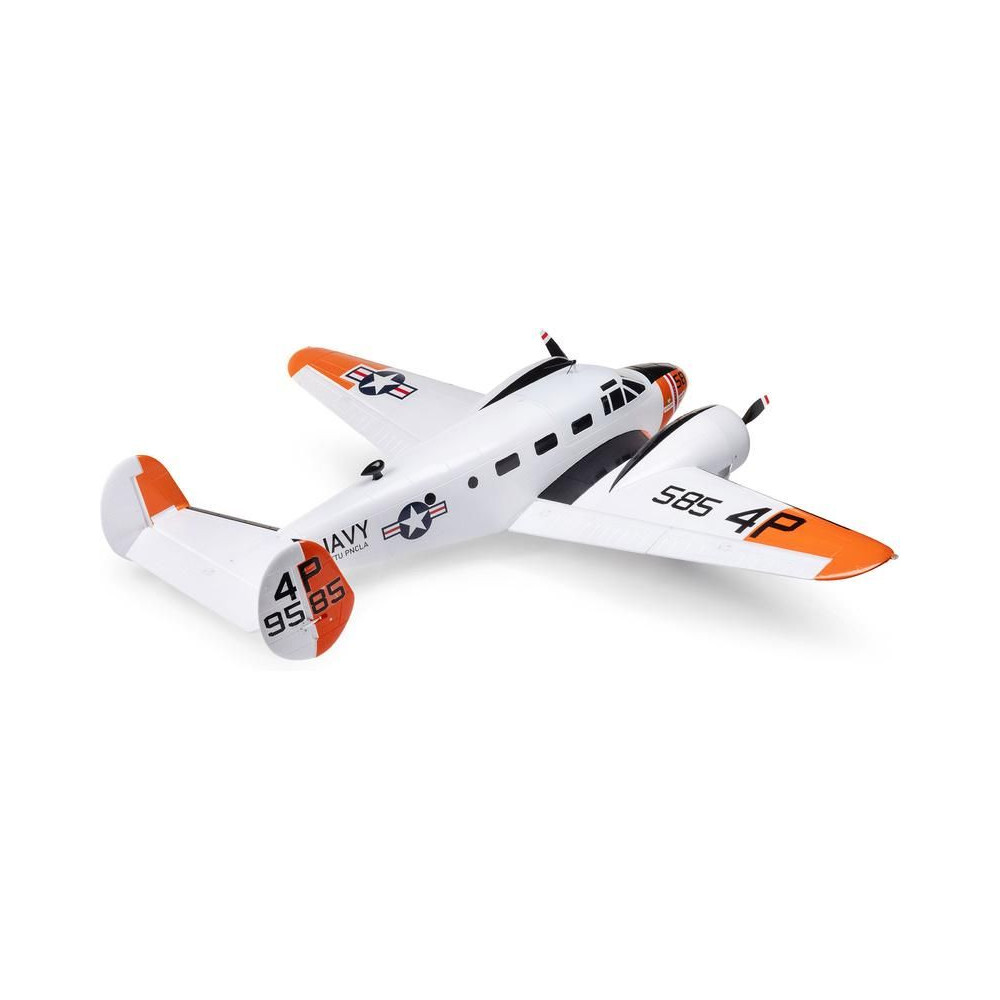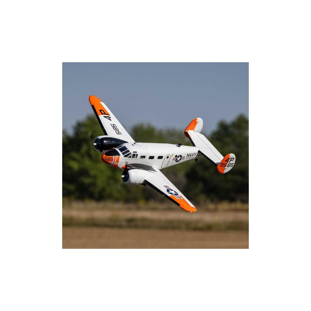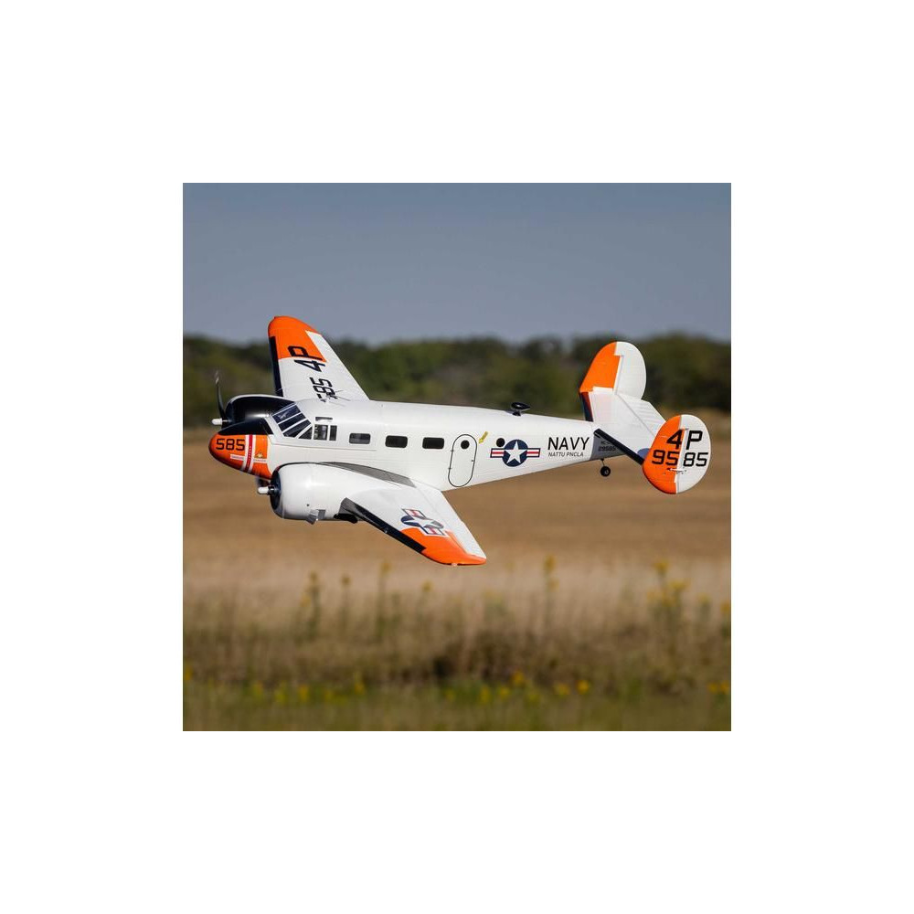 A híres amerikai Beechcraft D18 repülőgép részletesen kidolgozott félmodellje az amerikai haditengerészet színeiben (RC-45J), egy teljesen működőképes E-flite távirányítású modellként, 1,5 m fesztávolsággal. Ez az egyik legfelhasználóbarátabb és legkönnyebben reptethető távirányítású modellje ennek a repülési ikonnak, amely rengeteg funkcióval rendelkezik. Két ellentétesen forgó motor, valamint egy Spektrum vezérlő, amely 3S - 4S LiPo 3200–5000 mAh tápegységgel is választható, bőséges teljesítményt biztosít mind a normál, mind a sportrepüléshez. A dupla kormánykerék szintén hozzájárul a kiváló irányíthatósághoz. A teljes felszerelést funkcionális felszállási és leszállási fékszárnyak, valamint elektromosan behúzható, tartós fém alkatrészekből készült futómű segíti. A LED-világítás a jó tájékozódás és a csodálatos megjelenés érdekében beépített.