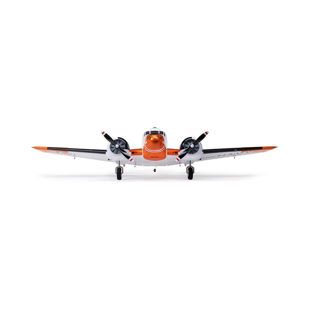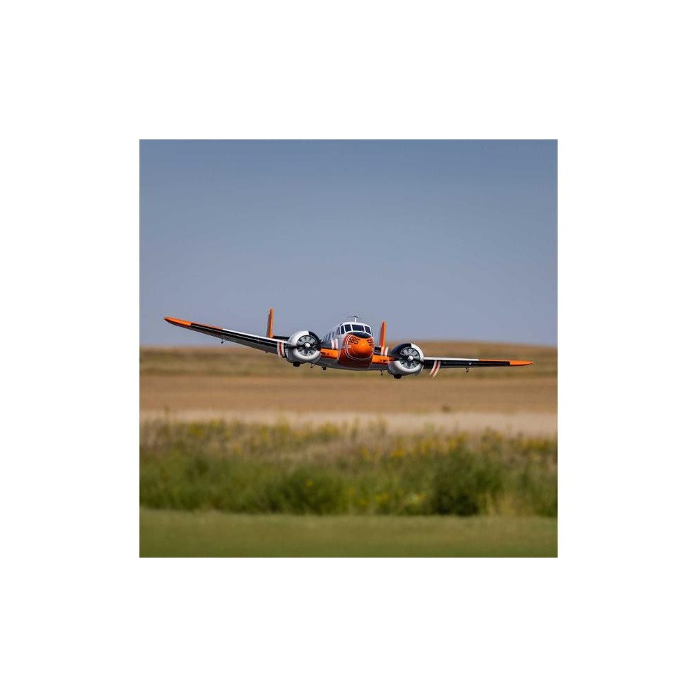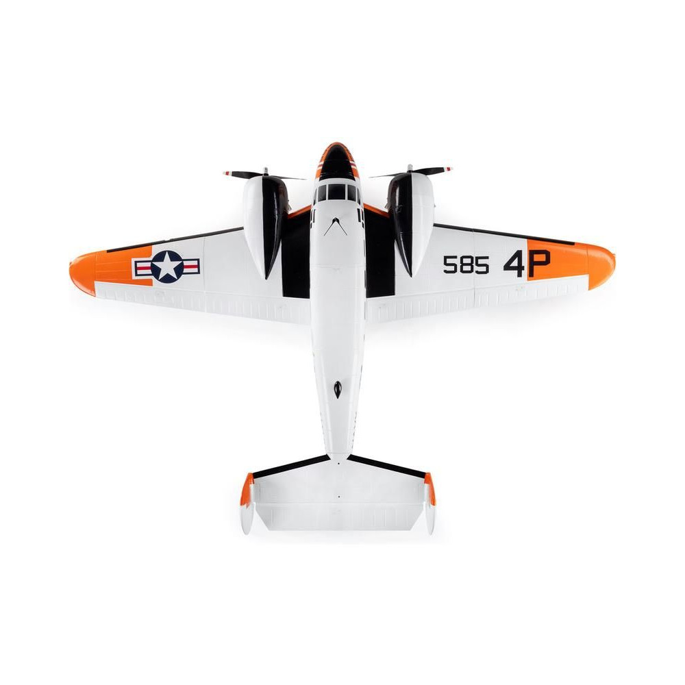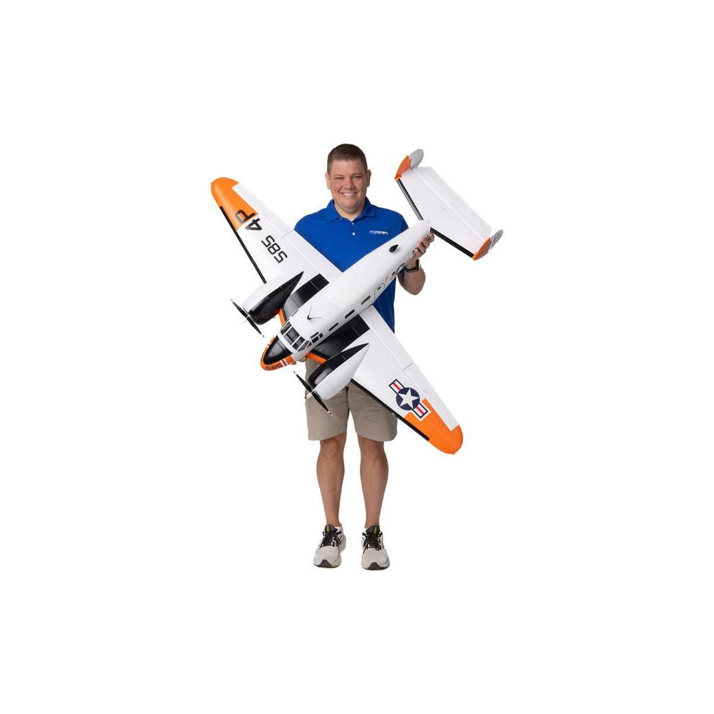 A híres amerikai Beechcraft D18 repülőgép részletesen kidolgozott félmodellje az amerikai haditengerészet színeiben (RC-45J), egy teljesen működőképes E-flite távirányítású modellként, 1,5 m fesztávolsággal. Ez az egyik legfelhasználóbarátabb és legkönnyebben reptethető távirányítású modellje ennek a repülési ikonnak, amely rengeteg funkcióval rendelkezik. Két ellentétesen forgó motor, valamint egy Spektrum vezérlő, amely 3S - 4S LiPo 3200–5000 mAh tápegységgel is választható, bőséges teljesítményt biztosít mind a normál, mind a sportrepüléshez. A dupla kormánykerék szintén hozzájárul a kiváló irányíthatósághoz. A teljes felszerelést funkcionális felszállási és leszállási fékszárnyak, valamint elektromosan behúzható, tartós fém alkatrészekből készült futómű segíti. A LED-világítás a jó tájékozódás és a csodálatos megjelenés érdekében beépített.