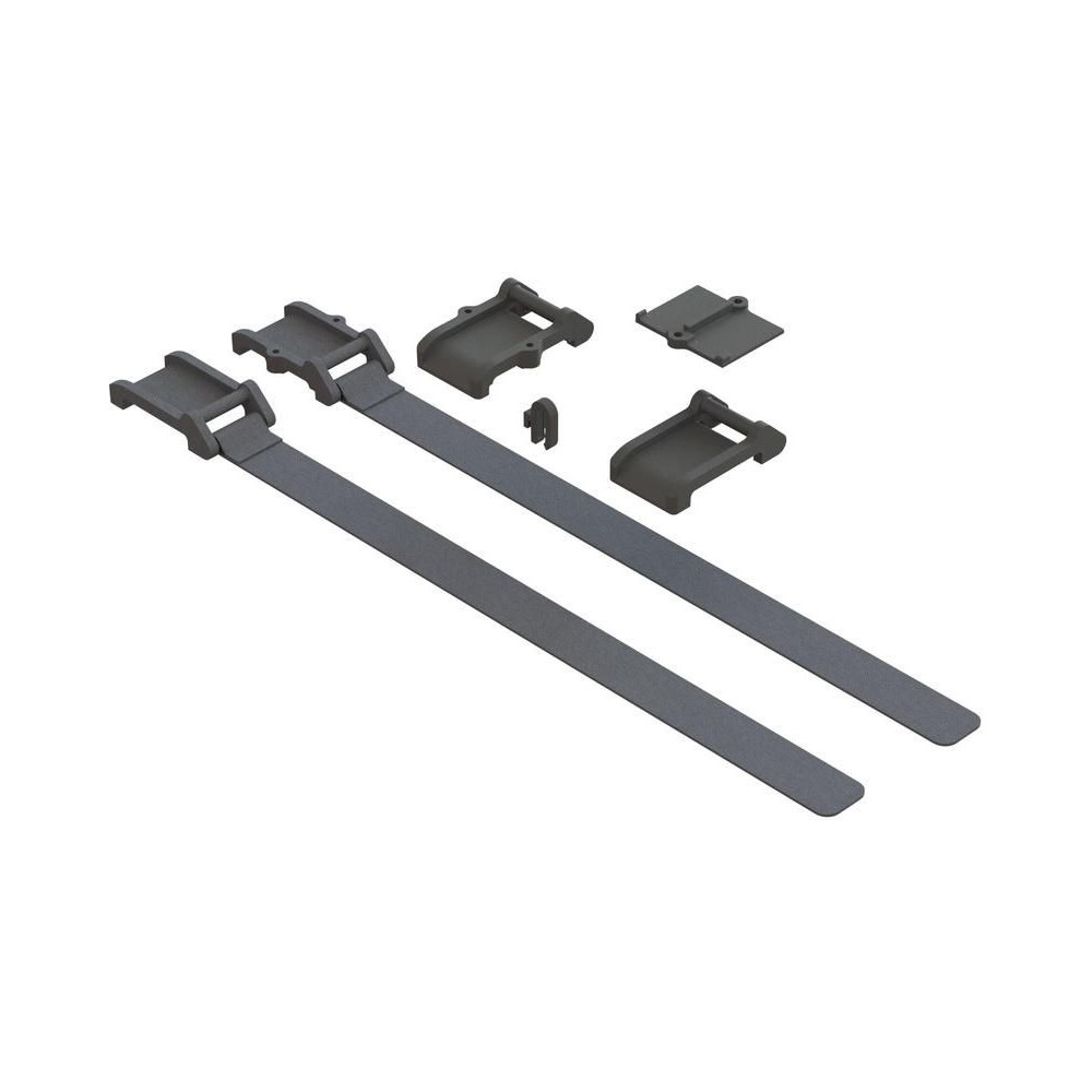 Cserealkatrész ARRMA Kraton és Outcast 4S V2 BLX 1:10 4WD RC autó modellekhez: tépőzáras hevederek az akkumulátor rögzítéséhez.