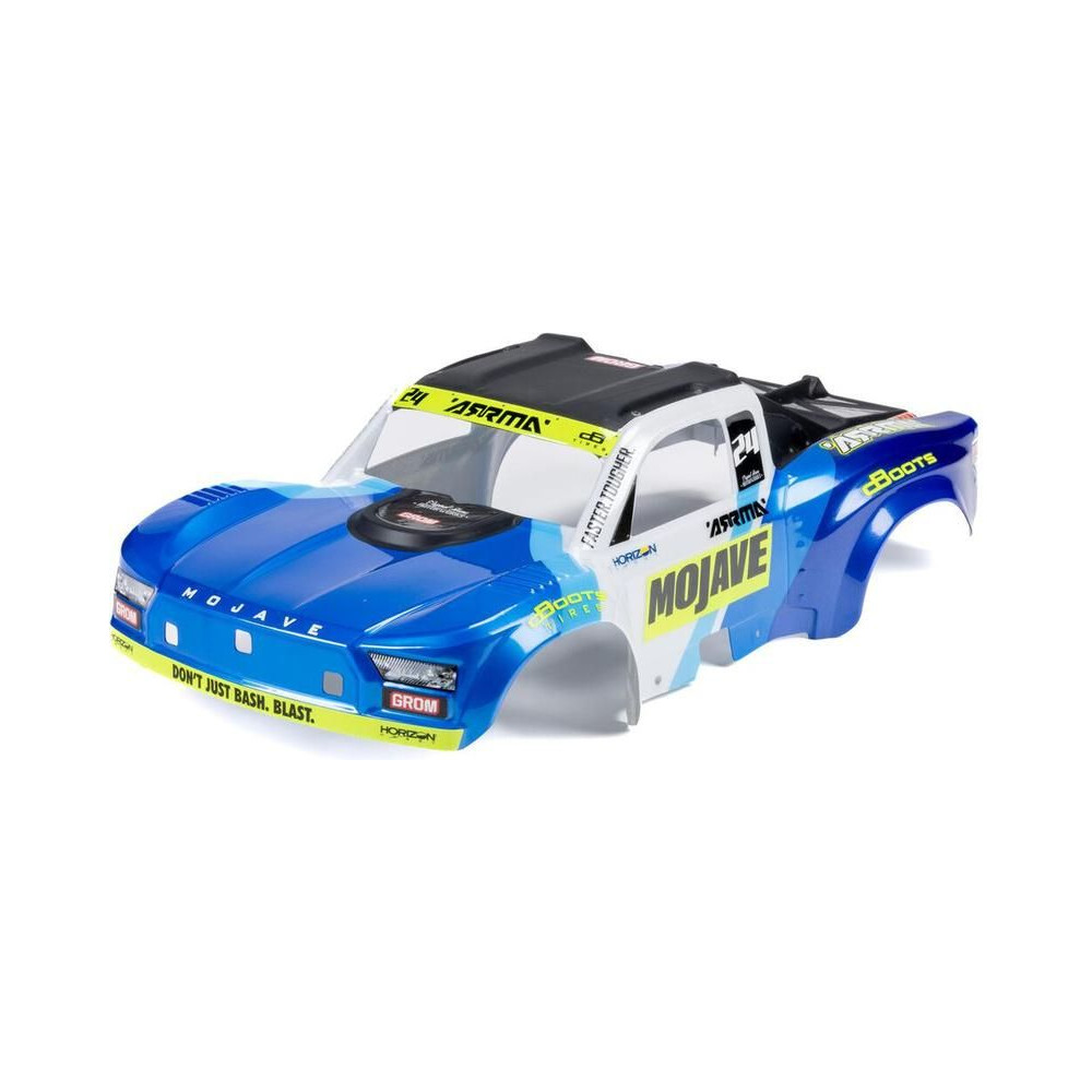 Pótalkatrész RC autó modellekhez Arrma Grom Mojave: karosszéria kék/fehér. A kész festett karosszéria tökéletes helyettesítője az eredeti ARA2104-es autó karosszériájának.