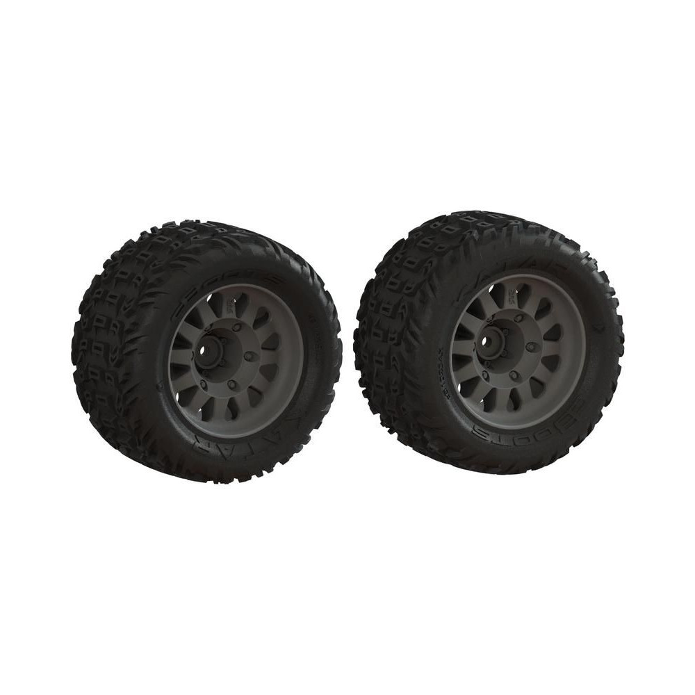 Pótalkatrész Arrma Mega 550 RC autó modellekhez: kerék abroncsokkal dBoots Qatar (2). Méretek ⌀115x52 mm. A hordozó 14 mm-es hatszögletű. Gumiabroncsok 2,8" dBoots Qatar.