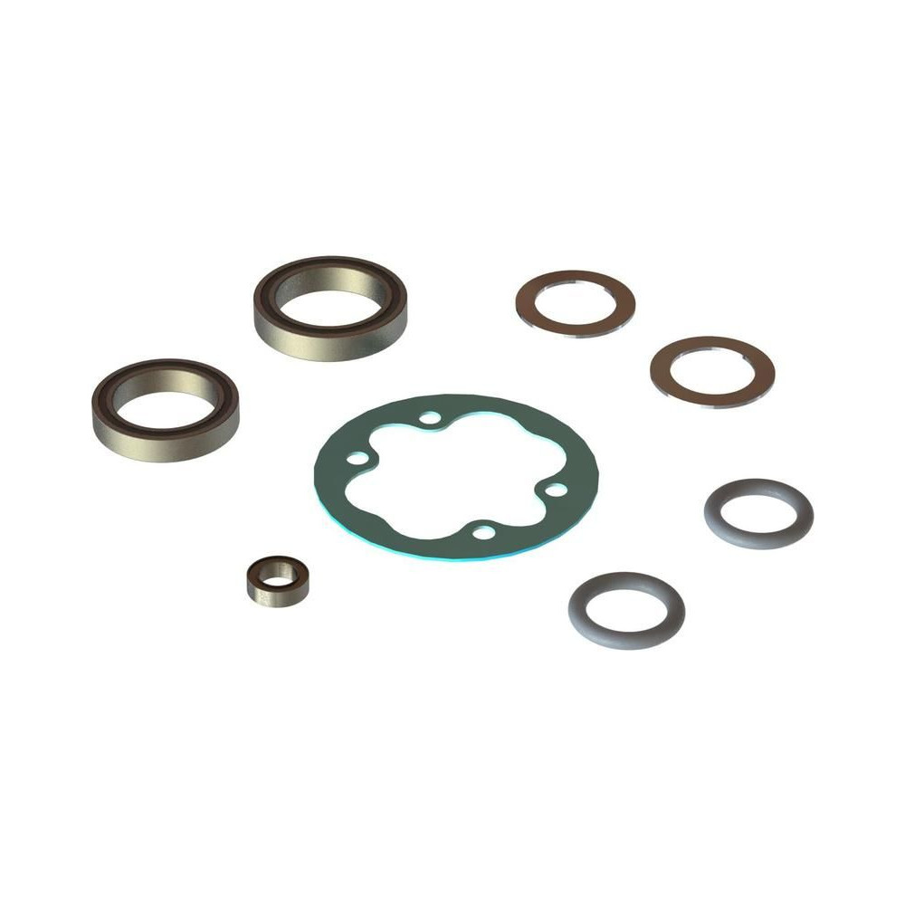 Alkatrész Arrma 4S RC autómodellekhez: középső differenciálmű javítókészlet. Tartalmaz 2x 9,8x2,2 mm-es O-gyűrűt, 1x 5x8x2,5 mm-es golyóscsapágyat, 2x 10,2x15x0,5 mm-es alátétet, differenciálmű tömítést, 2x 15x21x4 mm-es gumi csapágyfedelet.