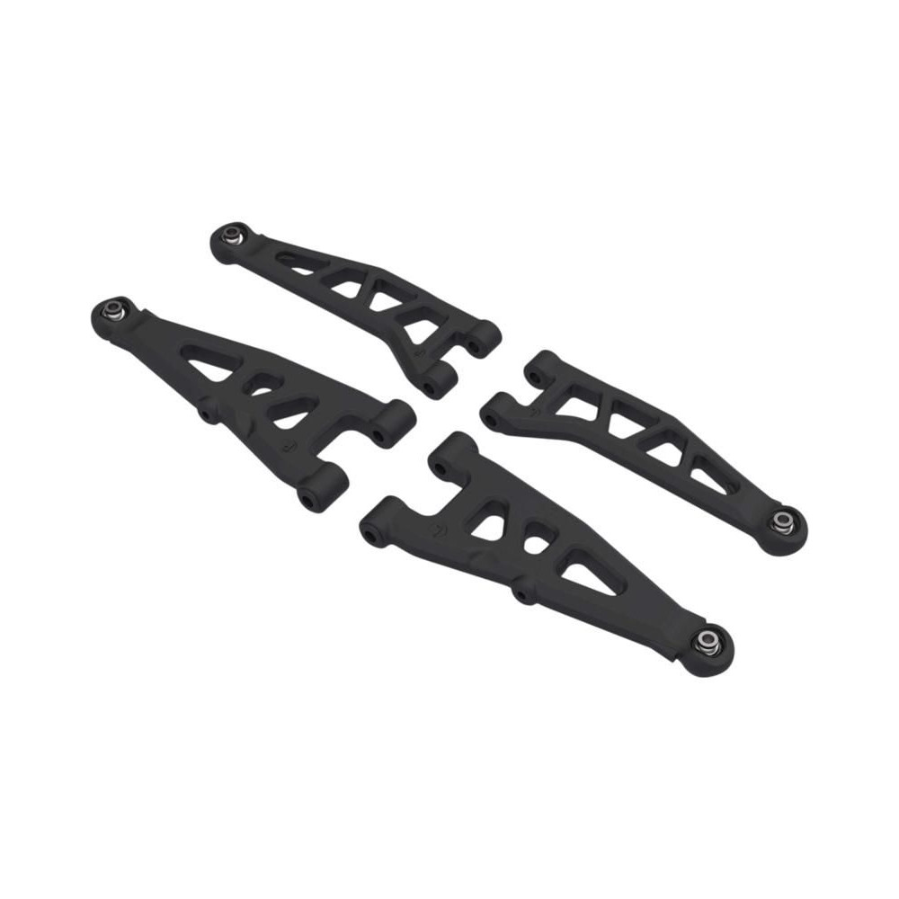 Arrma Mini 1:16 (Mini Kraton) RC autómodellek alkatrésze: D (2) első lengőkarok. A készlet tartalmaz egy pár felső első lengőkart és egy pár alsó első lengőkart, gömbcsuklókkal együtt.
