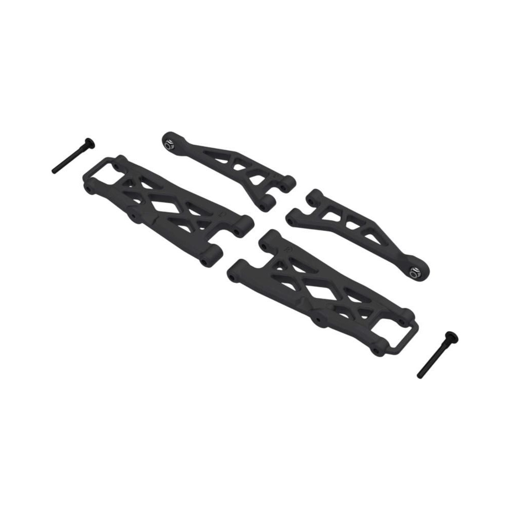 Alkatrész Arrma Mini 1:16 (Mini Kraton) RC autómodellekhez: D hátsó karok (2). A készlet tartalmaz egy pár felső hátsó karokat és egy pár alsó hátsó karokat, beleértve a gömbfejű csapokat és az M3,5 x 26,6 mm-es csapokat (2).