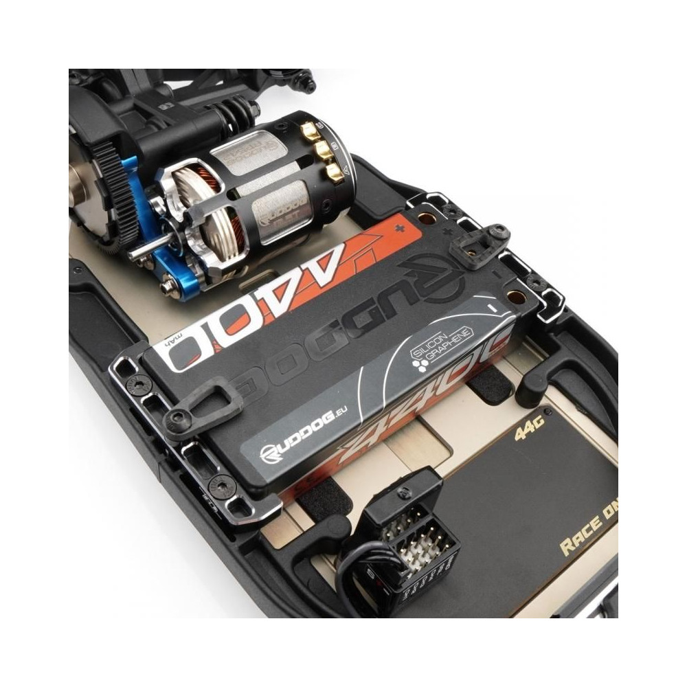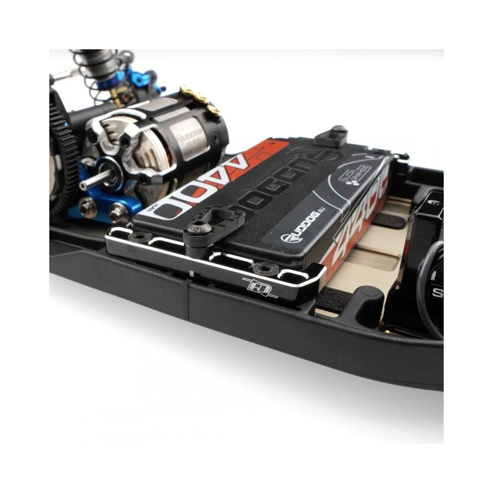 A Revolution Design Racing Products (RDRP) B7 Ultra LiPo akkumulátor tartó készlet (RDRP0648) a szabványos műanyag akkutartó közvetlen helyettesítője. Az alumínium akkumulátortartó készlet nem csak jól néz ki fekete eloxált alumíniummal és ezüstös fazettált élekkel, de stabilabb változat is, és biztonságosan a helyén tartja az akkumulátort. Az alumínium és a karbon alkatrészek kombinációja a Team Associated RC10B7 és RC10B7D buggy professzionális megjelenését is növeli, és lehetővé teszi a különböző kapacitású és méretű rövid akkumulátorok felszerelését. A készlet három különböző alátétmagasságot és csavarhosszúságot tartalmaz az akkumulátor tartó magasságának beállításához, és szerszám nélkül is lehet vele dolgozni.
