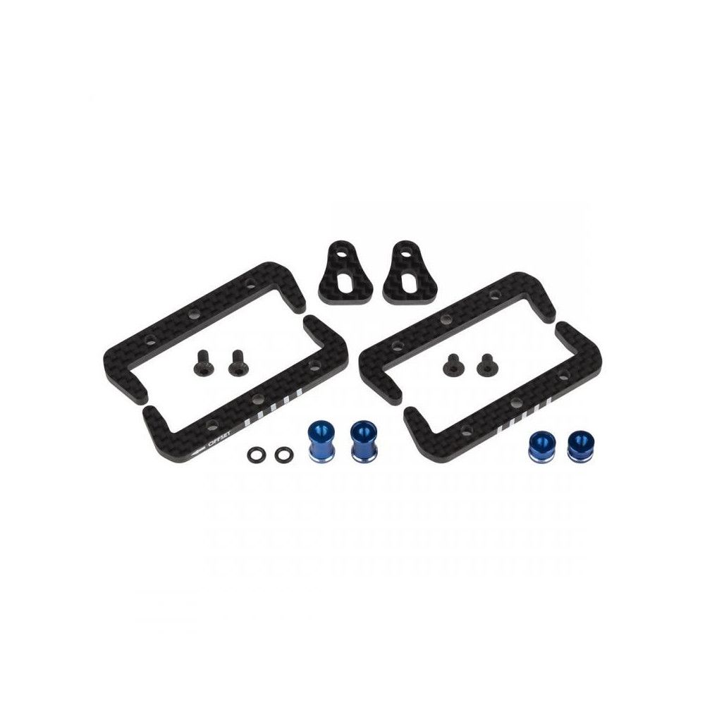 Ez a készlet a műanyag készlet alkatrészeket karbonra és kék eloxált alumíniumra cseréli a gyári megjelenés érdekében. A nyomtatott jelölések egyértelműen mutatják az akkumulátor pozícióját és a váltás irányát. A különböző vastagságú akkumulátorok befogadására standard és alacsony profilú oszlopok is szerepelnek.