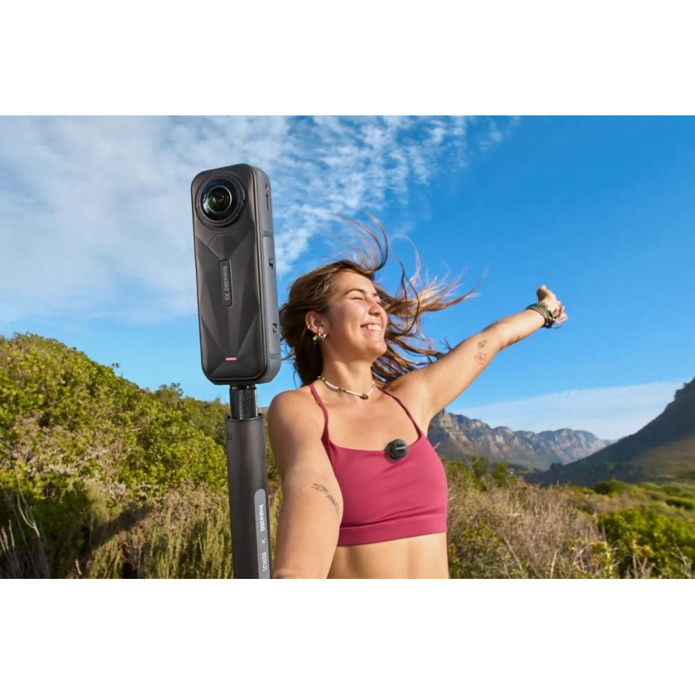 Az Insta360 Mic Air Transmitter egy ultrakönnyű vezeték nélküli mikrofon, amely 7,9 g súlyú és 2,7 cm x 1,2 cm méretű, 48 kHz/24 bites felvétellel. Aktív zajszűrést, 30-50 m hatótávolságot és akár 7,5 órás üzemidőt kínál. Rögzítés mágnessel, csipesszel vagy csuklópánttal. Vezeték nélküli kapcsolat Insta360 kamerákkal (X5, Ace Pro 2) vevőegység nélkül. A mikrofon testén gombok találhatók a kikapcsoláshoz, a zajszűréshez és a némításhoz. Töltés USB-C csatlakozón keresztül.