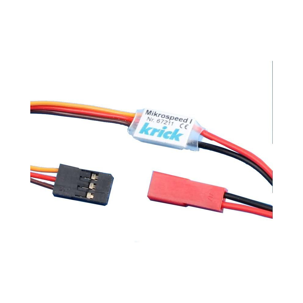 A Mikrospeed szabályzó súlya 3g, egyenáramú mikromotorokhoz készült, 4,8-6V-os tápfeszültséggel és legfeljebb 1A fogyasztással. A sebességszabályozót arányos vagy kapcsolócsatornával lehet vezérelni, a villanymotor közvetlenül a vevőről, azaz annak akkumulátoráról kapja az áramot.