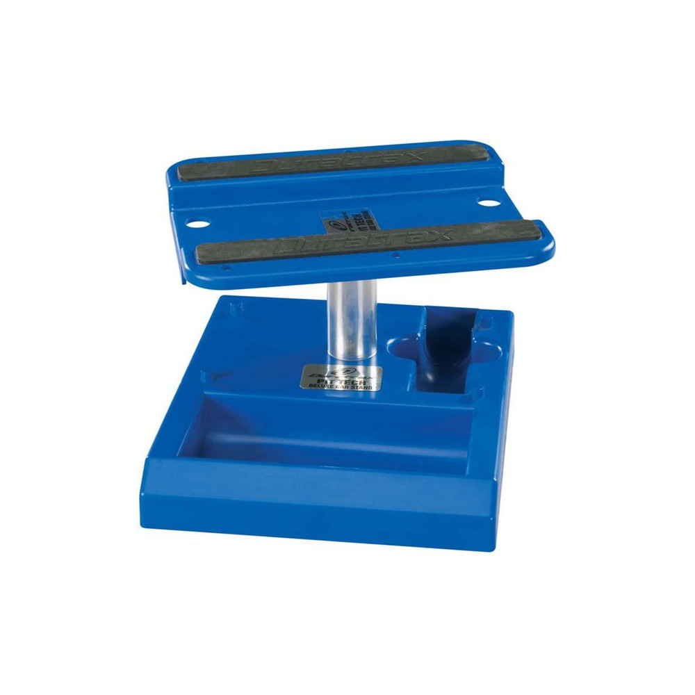 Duratrax Pit Tech Deluxe autószerelő állvány kék 1:10 méretarányban. Az állványlapokon található gumibakok tartják a vázat az alátéten, a robusztus állvány könnyen szétszerelhető és gazdaságosan tárolható. A felső lemez forgatható, hasznos segédeszköz az autómodell szervizelésekor.