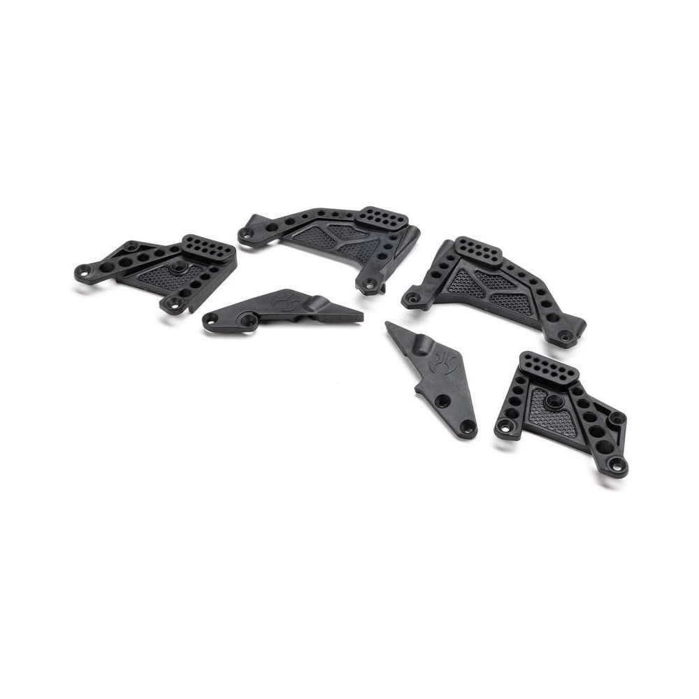 Axial SCX10 III HP RC modell autó alkatrész: lengéscsillapító tornyok és Panhard felfogatások, elöl/hátul. Több rögzítőfurattal rendelkezik a lengéscsillapítók szögének beállításához.
