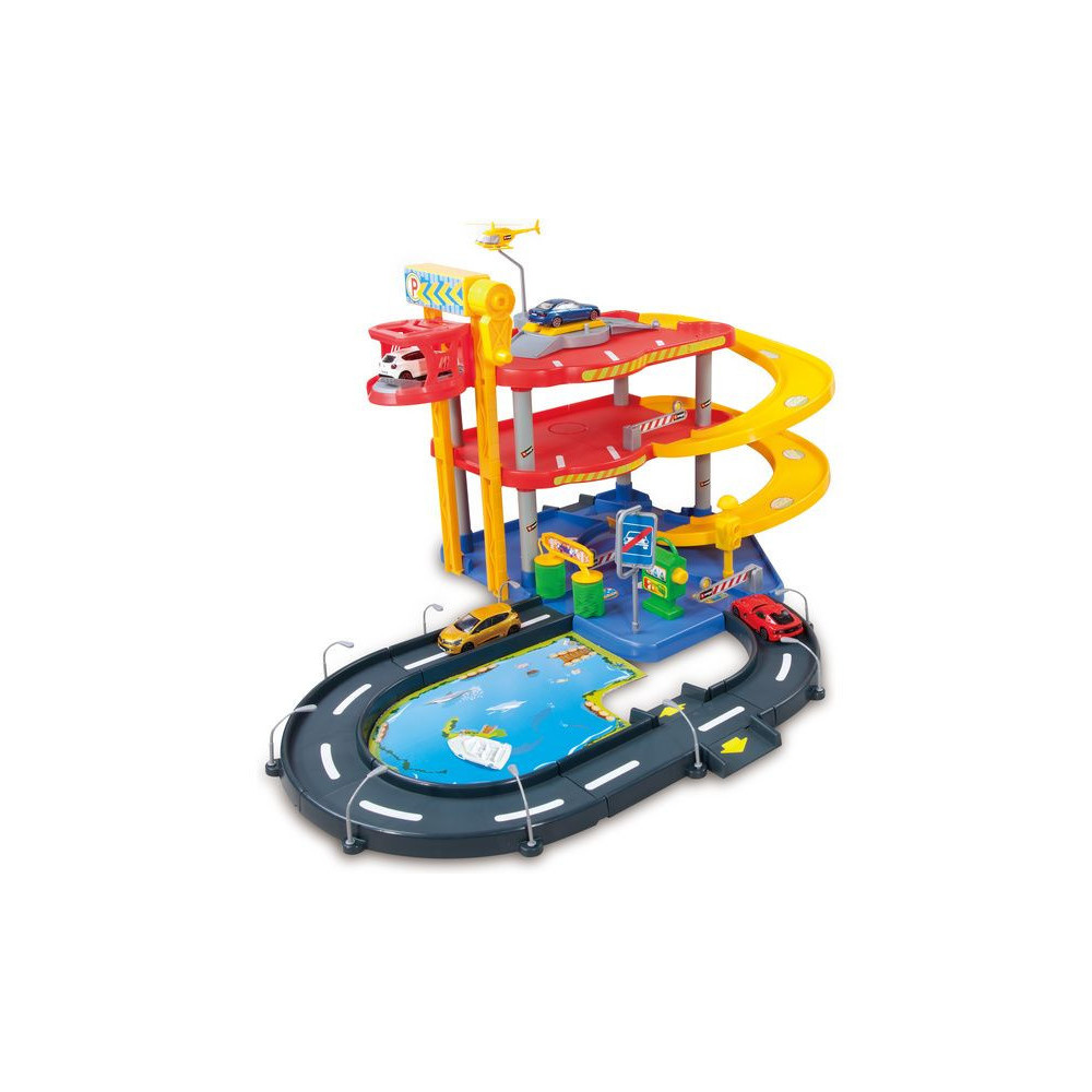 A vonzó színű műanyag alkatrészekből készült garázs könnyen össze- és szétszerelhető. Ezután már csak a saját fantáziádat kell bevetned, és kezdődhet a végtelen szórakozás és kaland. Az autó felemelhető bármelyik emeletre, leereszthető a garázs minden emeletéről vezető lejtős úton, végül pedig áthajthat az autómosón!