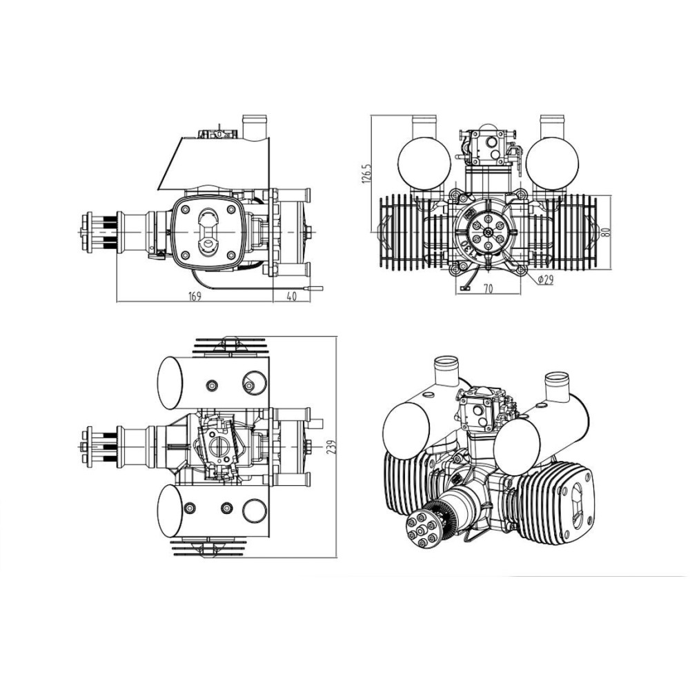 - Kéthengeres, kétütemű benzinmotor, amely szerkezetileg az egyhengeres NGH GT65-ön alapul