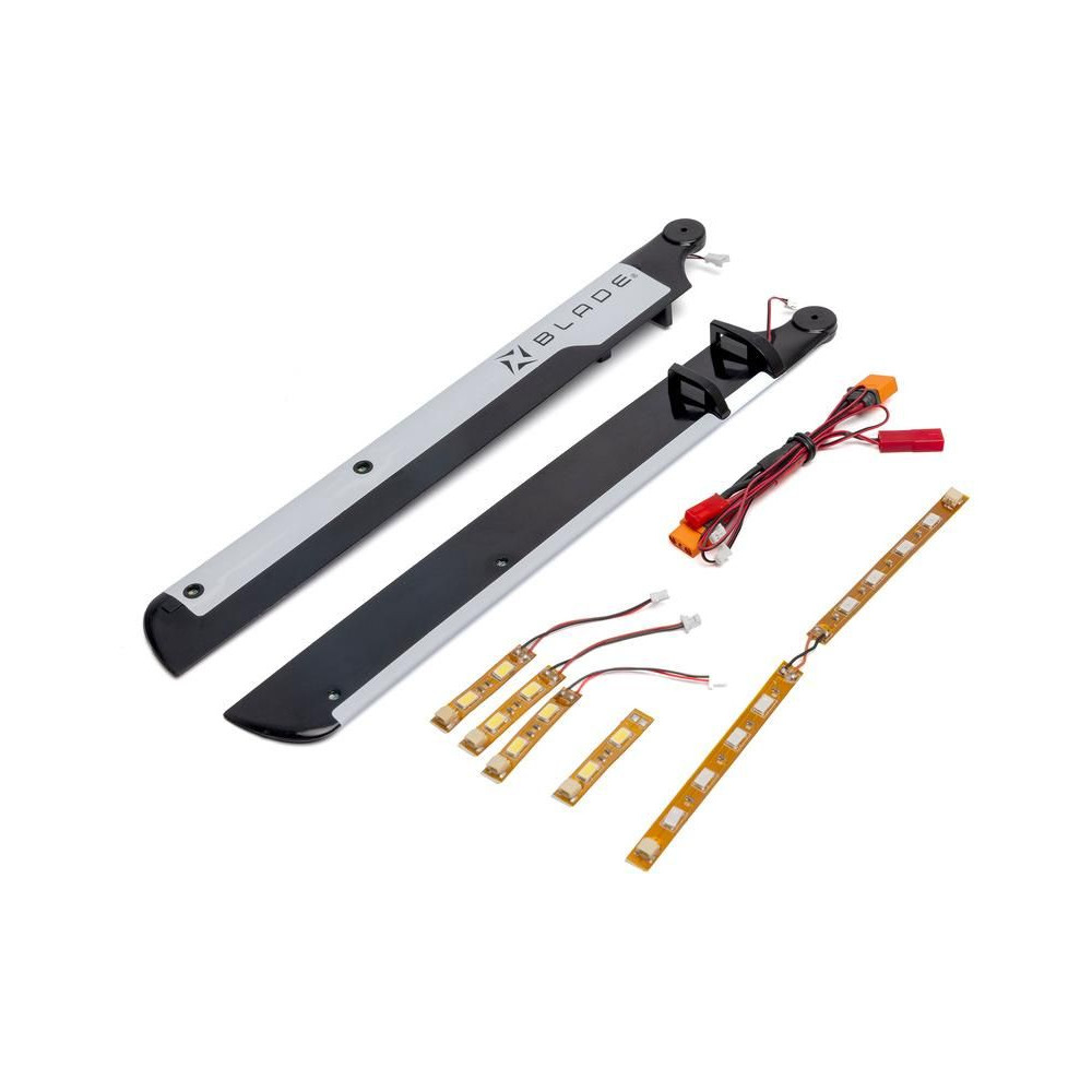 Tuning alkatrész a Blade Revolution 235 CP helikopter RC modelljéhez: komplett éjszakai LED világítás szett. 2 db 1S LiPo akkumulátor hozzáadása szükséges a LED-ek különálló lapokban történő táplálásához. A modellben található akkumulátor különálló LED-szalagokat működtet.
