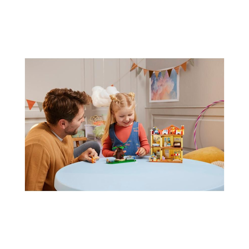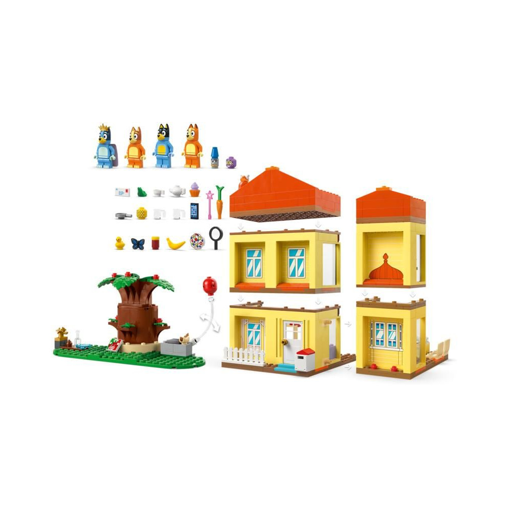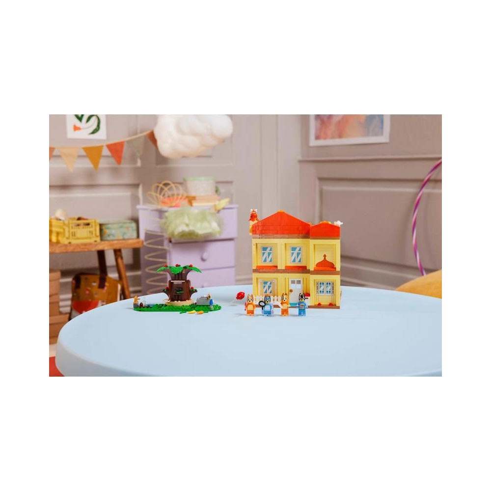 A több szobás moduláris ház 4 minifigurát tartalmaz – Bluey-t, Bingót, Chillit (Blue anyukáját) és Banditot (Blue apukáját) –, valamint számos kiegészítőt, többek között szivárvány köpenyt, pálcát és nagyítót. A gyerekek leválaszthatják az összes szobát, így számos játéklehetőséget élvezhetnek. A játszószobában találsz egy babaházat, egy zongorát és egy ételtartót. A konyhában hűtőszekrény, sütő, tűzhely, asztal és székek találhatók. Anya és apa hálószobája és fürdőszobája az emeleten található. Bluey és Bingo padlásszobájában egy szőnyeg, egy lámpa és egy Kecala figura található. A következő szobában megtalálod a királynő trónját egy teáskannával, egy csészével és egy békával. A kertben van egy nagy fa, egy hot dog, egy pizza, egy vízcsap, Jeremy, a törpe és egy lufi, amit a szereplők a levegőbe dobhatnak.