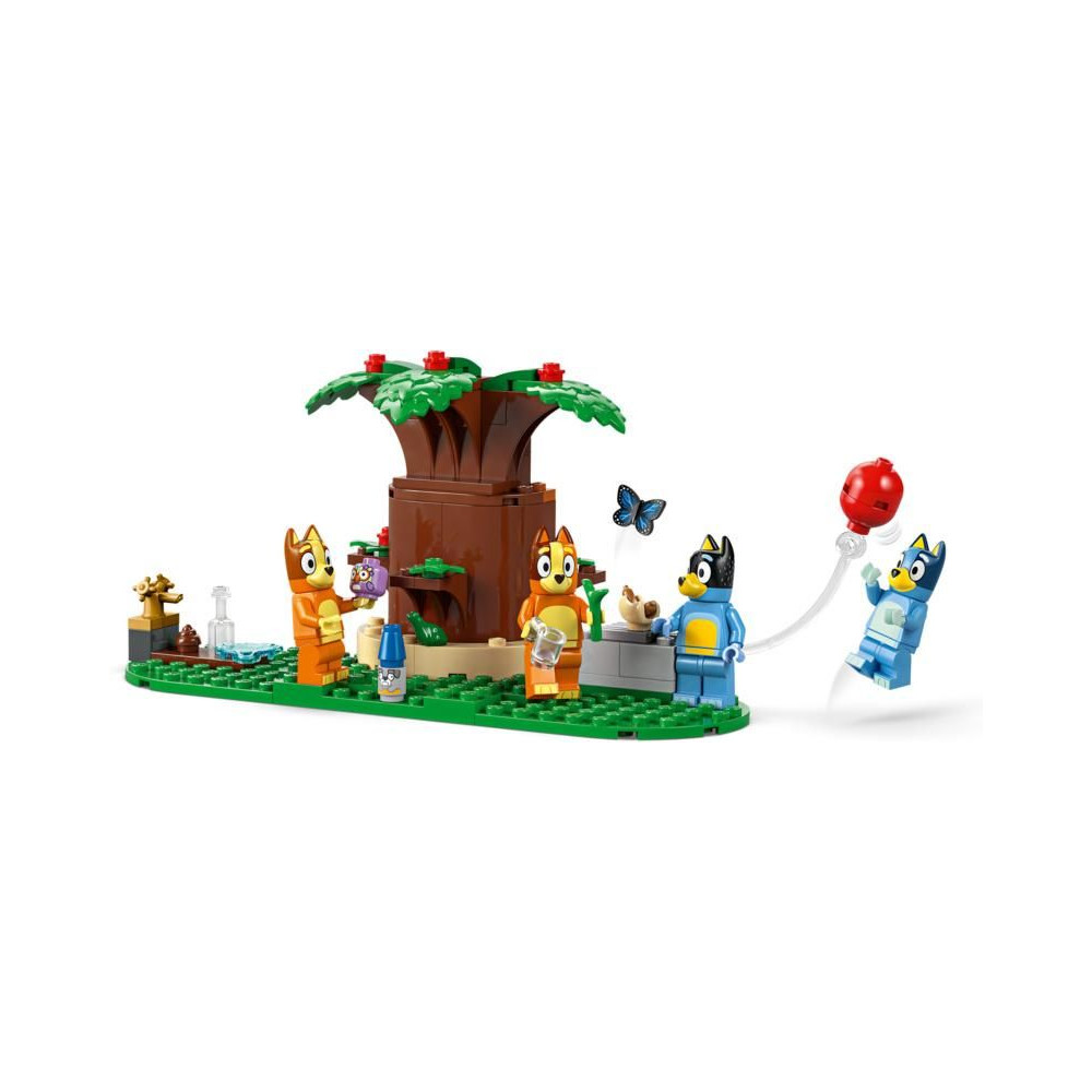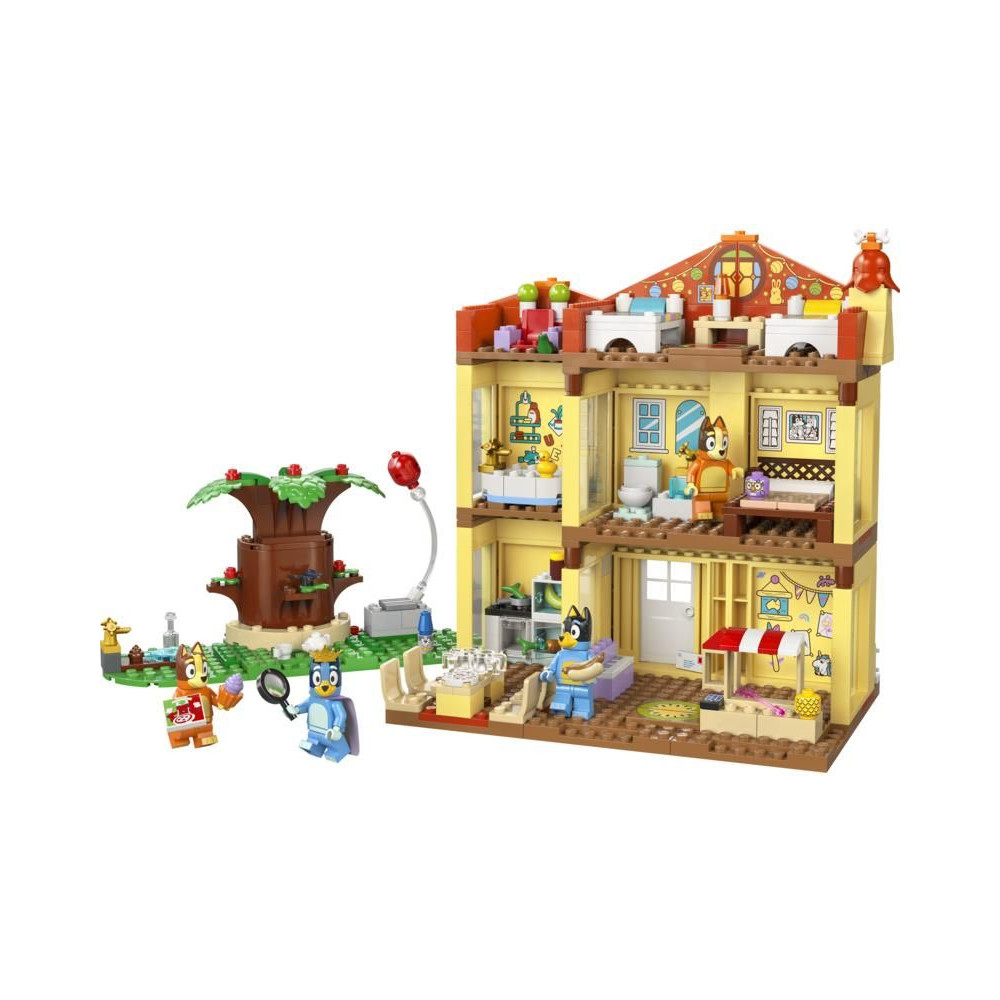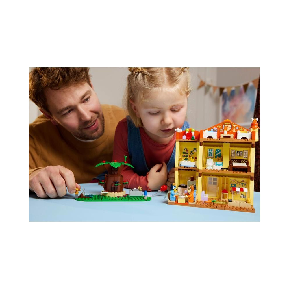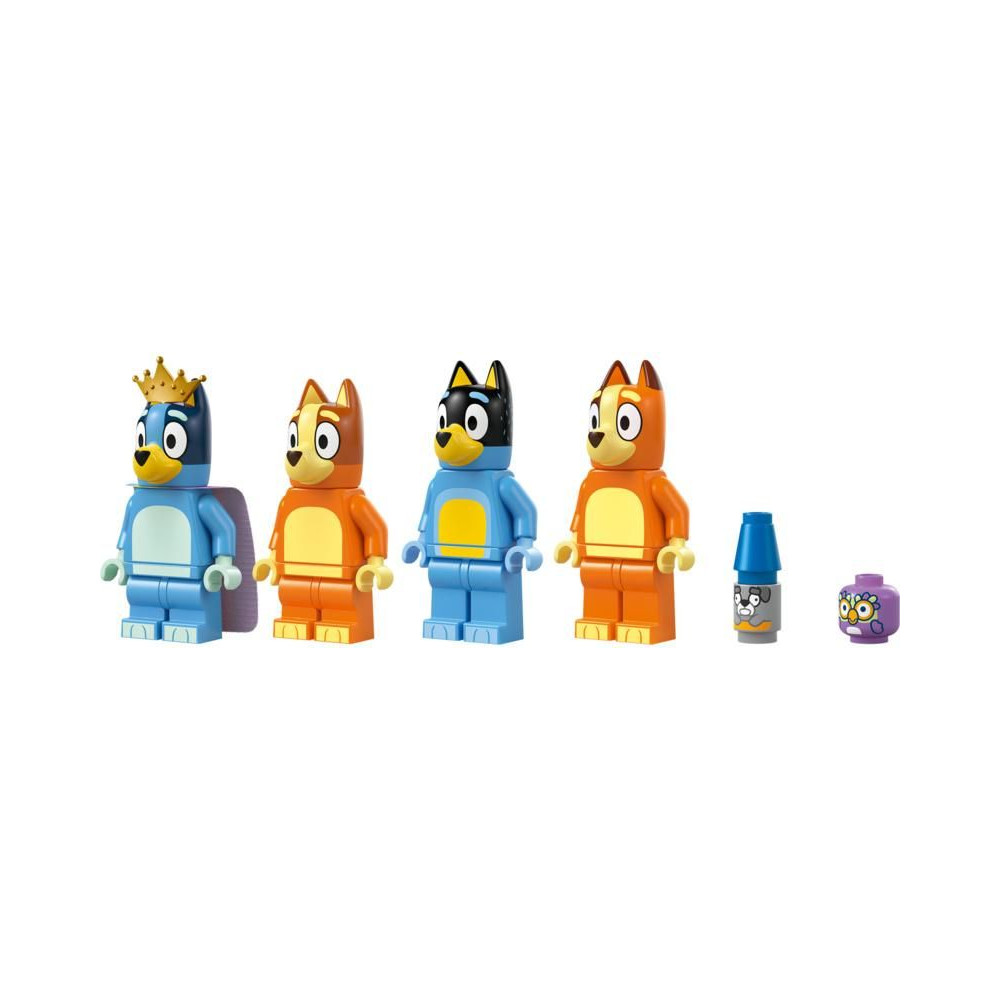 A több szobás moduláris ház 4 minifigurát tartalmaz – Bluey-t, Bingót, Chillit (Blue anyukáját) és Banditot (Blue apukáját) –, valamint számos kiegészítőt, többek között szivárvány köpenyt, pálcát és nagyítót. A gyerekek leválaszthatják az összes szobát, így számos játéklehetőséget élvezhetnek. A játszószobában találsz egy babaházat, egy zongorát és egy ételtartót. A konyhában hűtőszekrény, sütő, tűzhely, asztal és székek találhatók. Anya és apa hálószobája és fürdőszobája az emeleten található. Bluey és Bingo padlásszobájában egy szőnyeg, egy lámpa és egy Kecala figura található. A következő szobában megtalálod a királynő trónját egy teáskannával, egy csészével és egy békával. A kertben van egy nagy fa, egy hot dog, egy pizza, egy vízcsap, Jeremy, a törpe és egy lufi, amit a szereplők a levegőbe dobhatnak.