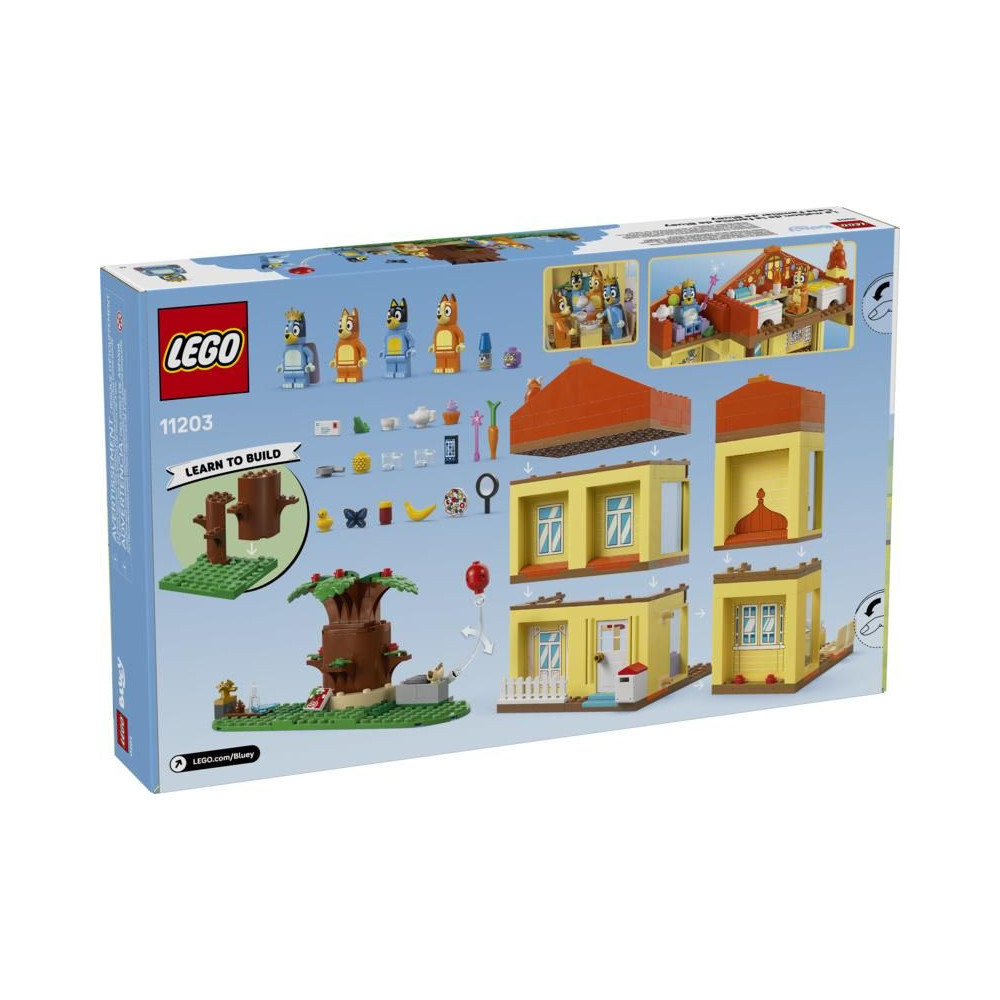 A kiváló minőségű Bluey és családi háza (11203) építőkészlet tele van a Bluey című tévésorozat elemeivel, játékaival és szereplőivel, amelyek arra inspirálják a 4 éves vagy annál idősebb gyermekeket, hogy kreatív játékokat találjanak ki Bluey-val és családjával.