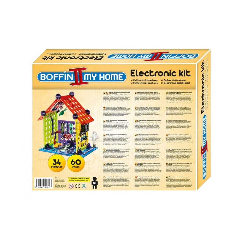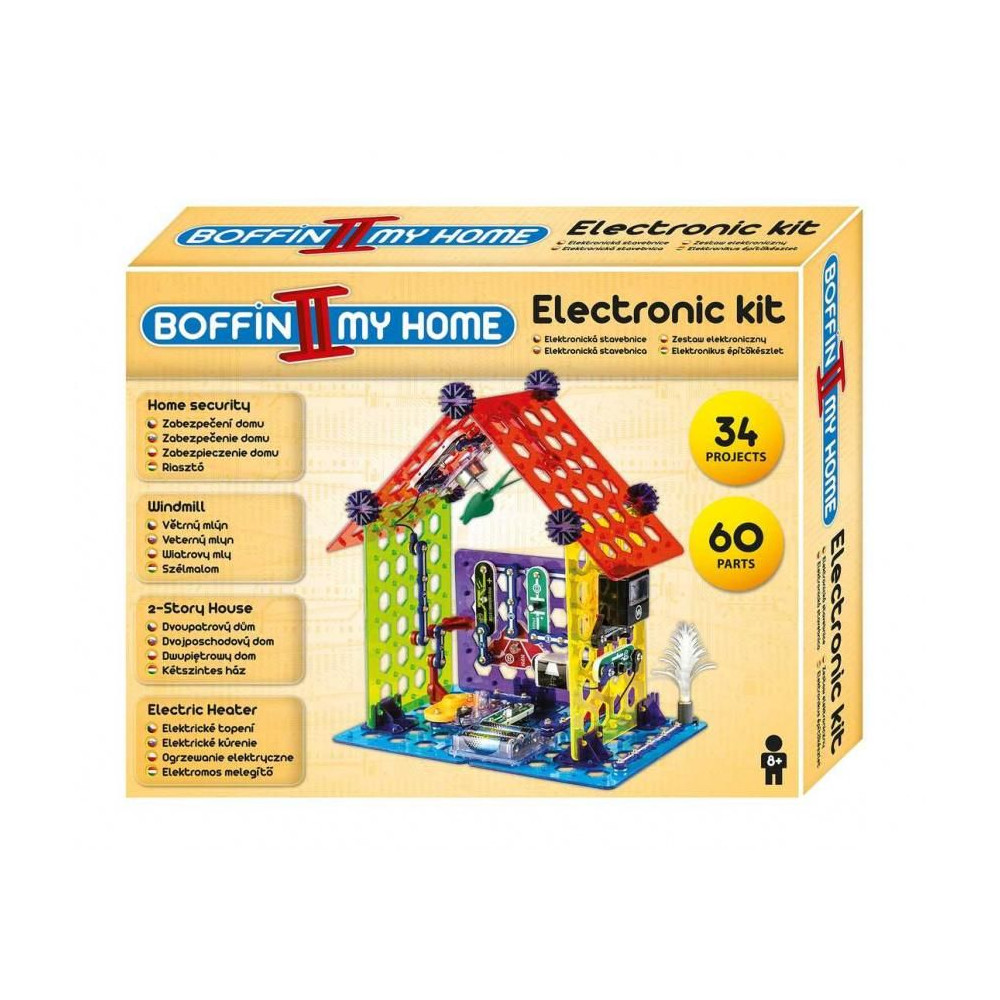A Boffin II Az én házam készlettel megtanulhatod, hogyan kerül az elektromosság a házakba, építhetsz fényérzékelőt, elektromos fűtőtestet, kétszintes házat, szélmalmot és más projekteket. A készlet 60 alkatrészt tartalmaz, amelyekből projekteket építhetsz: