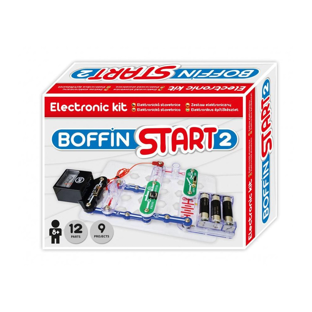 Bevezető sorozat a Boffin elektronikus készletek világába. A Boffin START 2 elektronikus készlet a következő projektek megépítéséhez szükséges alkatrészeket tartalmazza: