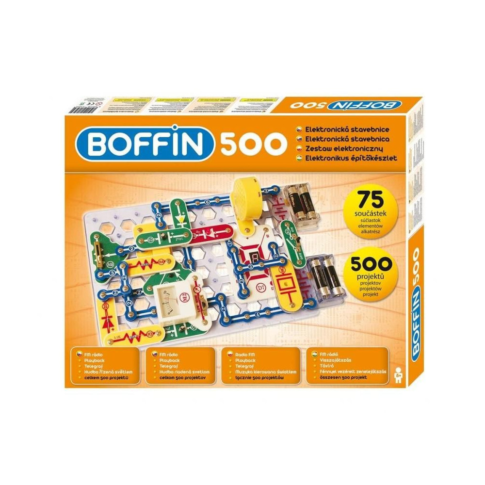 A Boffin I 500 elektronikus építő készlet 75 alkatrészt tartalmaz, amelyekből legalább 500 projekt építhető.