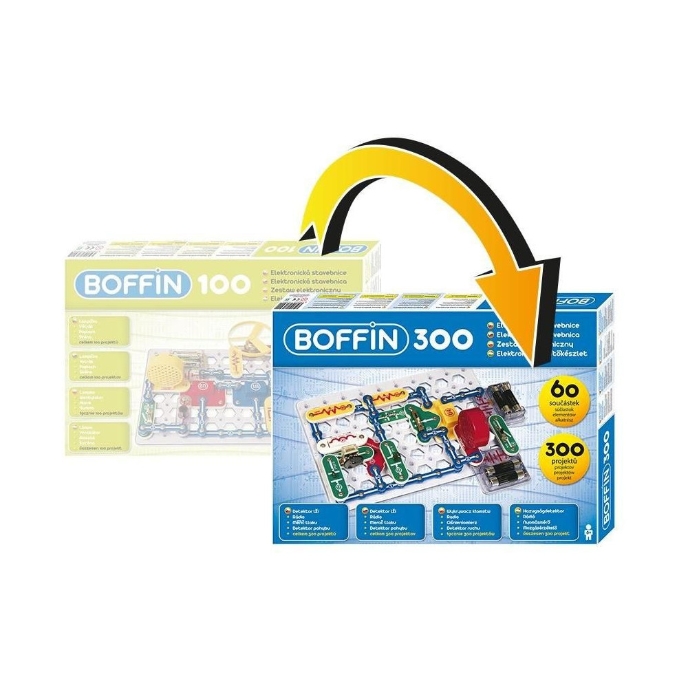 Bővítő készlet a Boffin 100 készlet bővítéséhez további alkatrészekkel és 200 új projekttel, hogy egy teljes értékű Boffin 300 készletet alkothasson.