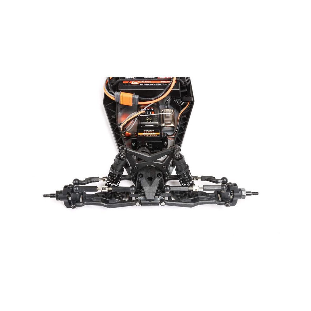 A Losi a Mini-B-t Wide Body Rib első gumiabroncsokkal és Big Shot hátsó gumiabroncsokkal szerelte fel, a futómű alumíniumlemezből készült, a váltó fém fogaskerekekkel rendelkezik, a lengéscsillapítók olajjal állíthatóak, és természetesen teljes golyóscsapágyazású. A kormányzásról egy SPEKTRUM SX108 szervó gondoskodik, fém fogaskerekekkel és hatékony szervócsatlakozással. A modellt SPEKTRUM SLT2 2,4GHz-es RC készlet vezérli SPEKTRUM SR315 vevővel. Az energiaellátás LiPol akkumulátor SPEKTRUM SMART G2 2S 7.4V 810mAh 50C. A töltő rendelkezésre áll Spektrum Smart G2 2S LiPo 2S USB-C.