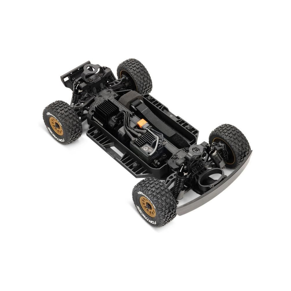 Az autó tökéletesen fel van készítve az igényes vezetési élményre, erős kompozit alvázzal, független felfüggesztéssel, olajlengések és 4WD meghajtás jellemzi. A robusztus fém differenciálművek zárt hajtásláncon keresztül továbbítják az erőt a váltakozó áramú motortól a dBoots Fortress kerekekhez és gumiabroncsokhoz. Még a Spektrum™ SX110 szervomotor is fém fogaskerekekkel rendelkezik, és a 2 az 1-ben 25 A-es vezérlőegységhez hasonlóan, amely IC2® csatlakozóval van felszerelve, vízálló*, így nedves környezetben is használható. Az integrált nagy sebességű hűtőventilátor alacsonyan tartja a motor és a vezérlő hőmérsékletét a hosszú élettartam és a csúcsteljesítmény érdekében.