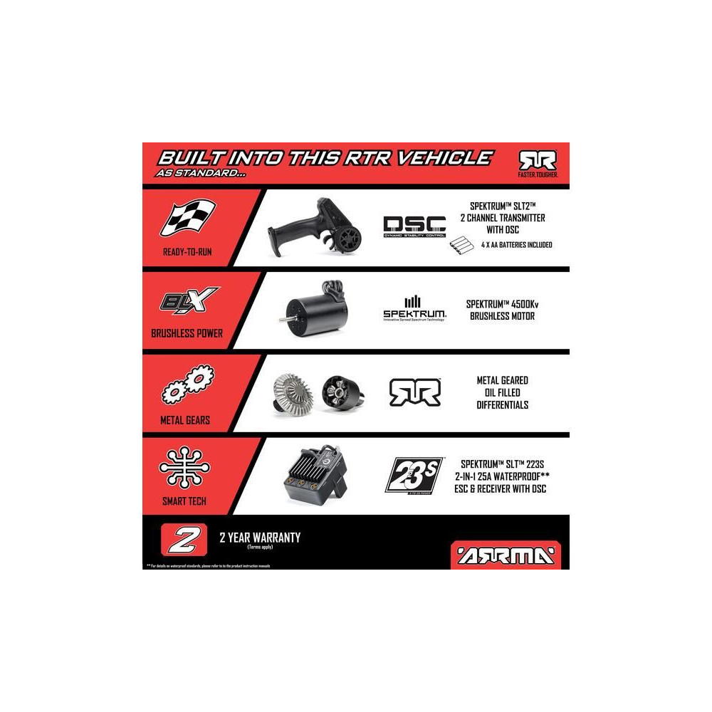 A tartósság és a megnövelt teljesítmény érdekében a modell gyárilag beépített fejlesztésekkel rendelkezik - teljes fém fogaskerekes differenciálművek (ARA311193), acéltengelyek (ARA311198), alumínium olajlengéscsillapítók (ARA-1560) és alumínium állítható tengelyek. kormánytengelykapcsolók (ARA340208). A fent említett fejlesztések ellenére a modell továbbra is kedvező áron kínálja szolgáltatásait.