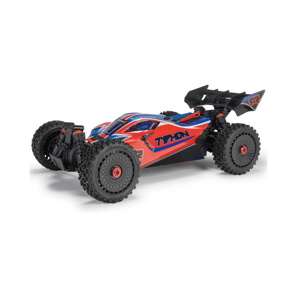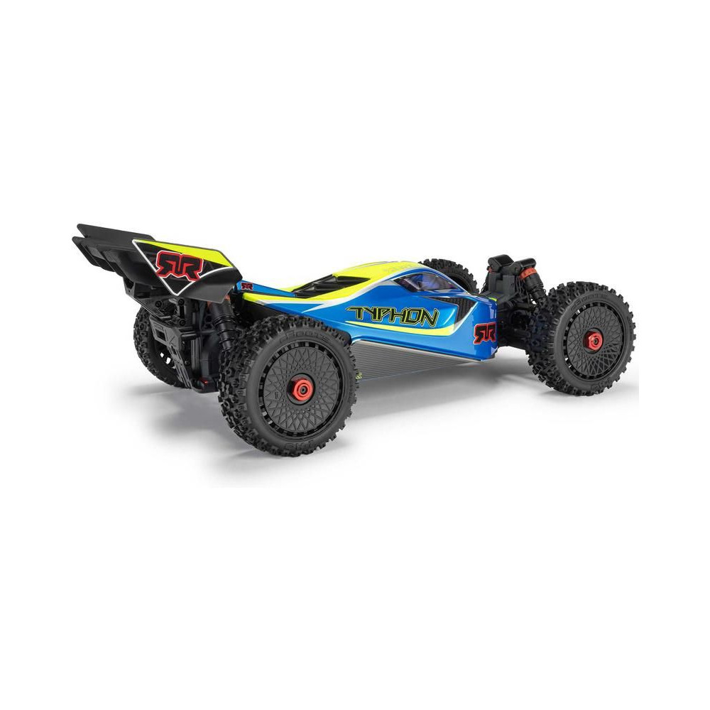 RC modell buggy Arrma Typhon Mega 1:8 méretarányban, 4x4 meghajtással és akár 32 km/h sebességgel. Tartós alváz csúszó lemezekkel és megemelt oldalfalakkal. Robusztus differenciálművek fém fogaskerekekkel. Túlméretezett, 11%-kal nagyobb egyenáramú motor, 665. Olajcsillapítók. Spektrum SLT2 távirányítós készlet.