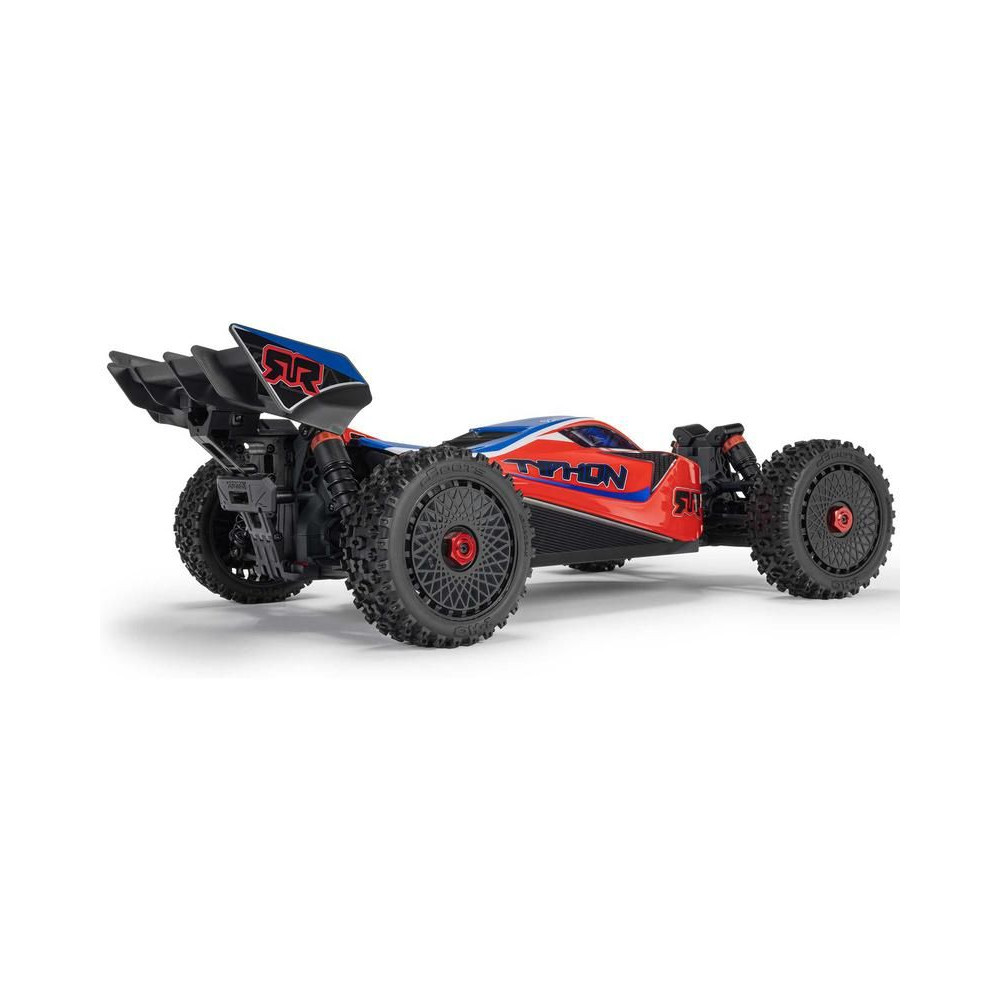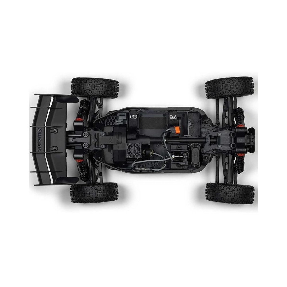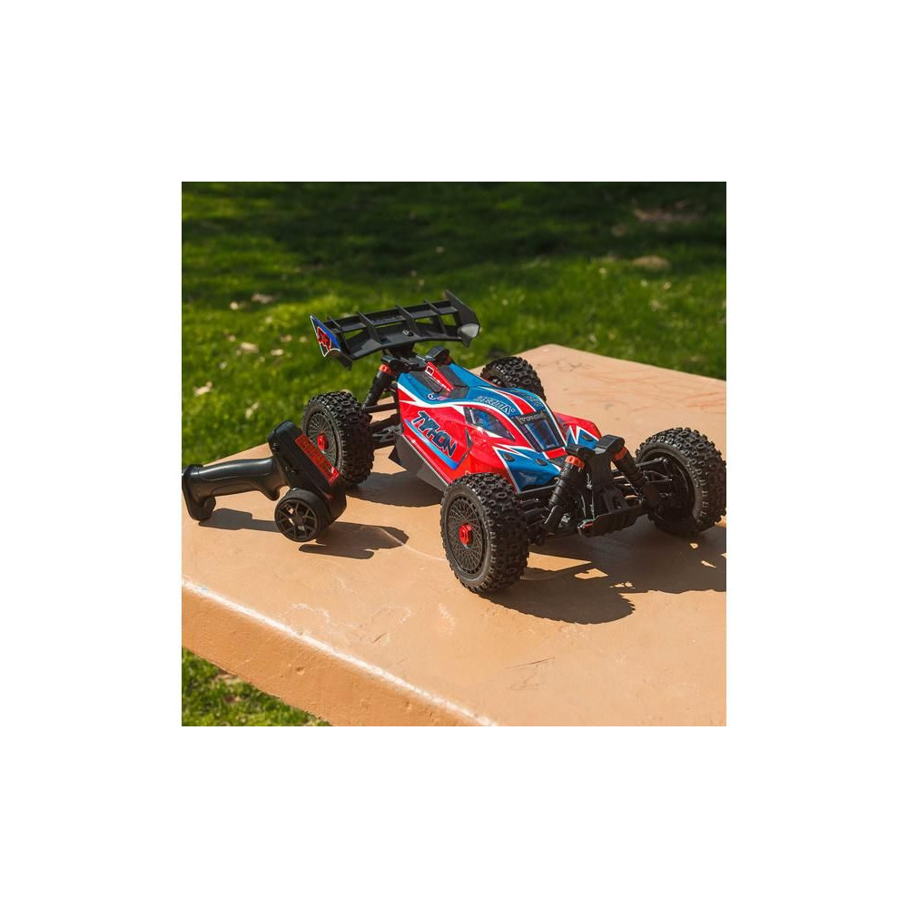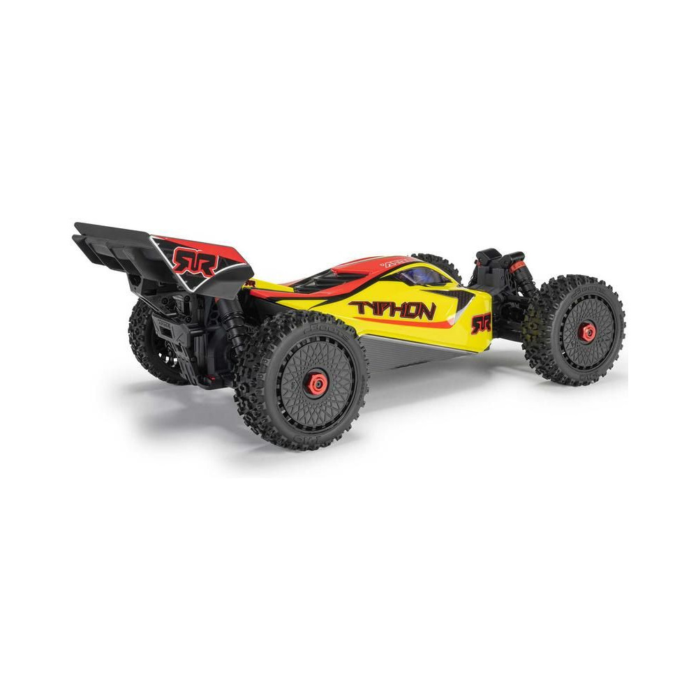 RC modell buggy Arrma Typhon Mega 1:8 méretarányban, 4x4 meghajtással és akár 32 km/h sebességgel. Tartós alváz csúszó lemezekkel és megemelt oldalfalakkal. Robusztus differenciálművek fém fogaskerekekkel. Túlméretezett, 11%-kal nagyobb egyenáramú motor, 665. Olajcsillapítók. Spektrum SLT2 távirányítós készlet.