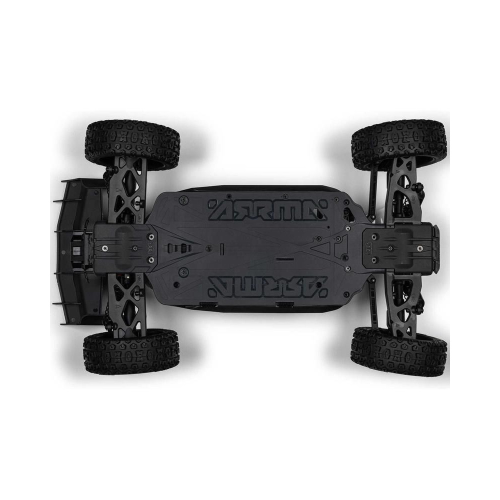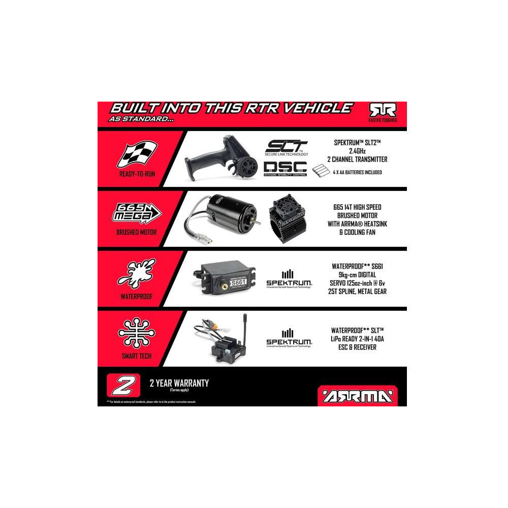 A karosszéria befejezett és festett, és egy rögzítőrendszerrel van felszerelve az alvázhoz, hogy az akkumulátor könnyen cserélhető és hozzáférhessen az elektronikához. A modell egy minőségi Spektrum 2in1 vezérlőegységgel van felszerelve, amely integrált szabályozóval és vevővel rendelkezik. Az akkumulátor típusa könnyen beállítható a készüléken egy rövidzárlatos jumper segítségével. A készülék rendelkezik egy külső vevőegység csatlakoztatására szolgáló porttal is. A nagy 665-ös motor most egy alumínium hűtőt és egy 35 mm-es ventilátort tartalmaz, hogy minden körülmények között megfelelő üzemi hőmérsékletet tartson fenn. Csak add hozzá az akkumulátort és a töltőt (külön kaphatók), és máris indulhatsz az ARRMA TYPHON MEGA 665 4x4-gyel a kertben, a terepen vagy az alacsony fűben, és élvezheted a motorozást.