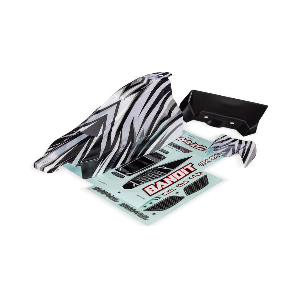 Traxxas Bandit ProGraphix karosszéria (szárnyon) - előre nyomtatott grafikával, festést igényel, tartós polikarbonátból készült, beleértve a hátsó szárnyat és az első spoilert. Matricalap. Traxxas Bandit és Bandit VXL modellekhez.