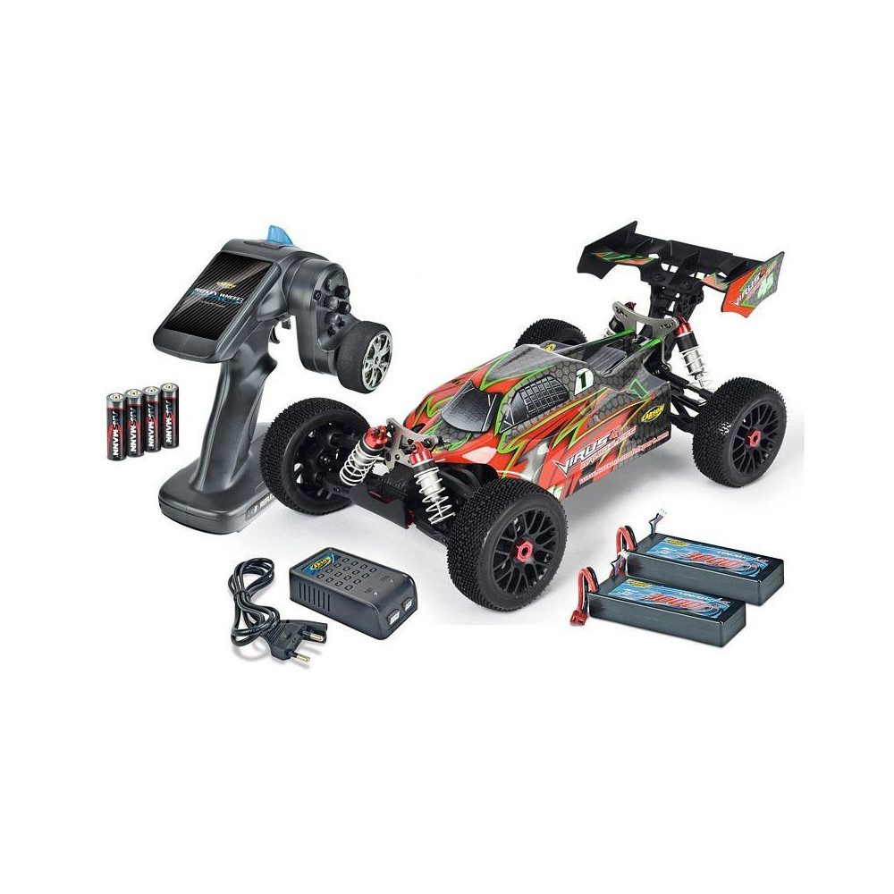 CARSON Virus 4.1 Brushless je inovatívny 4WD buggy s pretekárskym podvozkom optimalizovaným pre off-road s výkonnou bezkartáčovou mechanikou. Ma ochranu servo riadenia pred vlhkosťou .Robustný hliníkový rám s hrúbkou 3 mm je mimoriadne úzky a má prednú aj zadnú vzperu. Všestranné deflektory nečistôt zabezpečujú dlhotrvajúci pôžitok z jazdy. Bezkartáčový motor HOBBYWING s výkonom 2100 kV dodáva obrovský výkon pohonu všetkých štyroch kolies a zrýchľuje rýchlosť 4,1 na viac ako 80 km / h. Tlmiče tlaku hliníkového oleja Big Bore, nízke ťažisko a početné možnosti nastavenia zaisťujú dokonalú trakciu a nechajú CARSON Virus 4.1 Brushless lietať na všetky vzdialenosti.