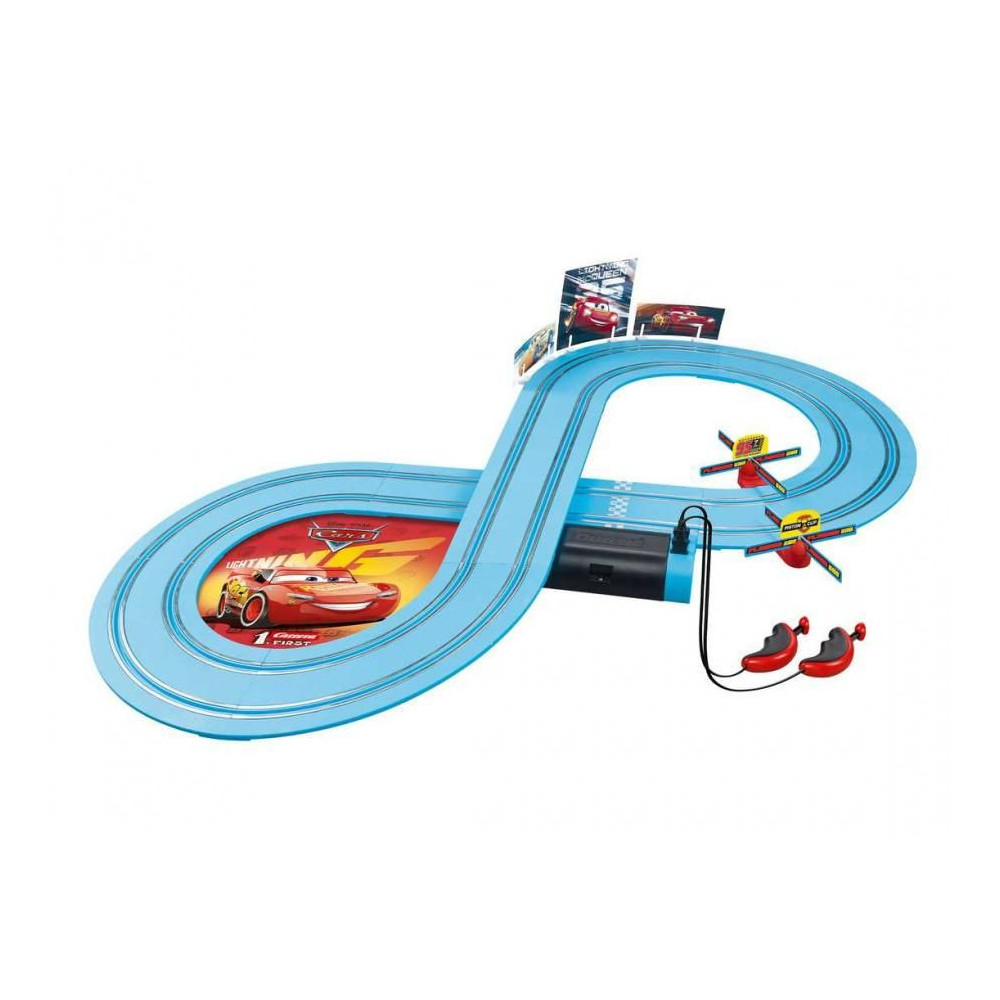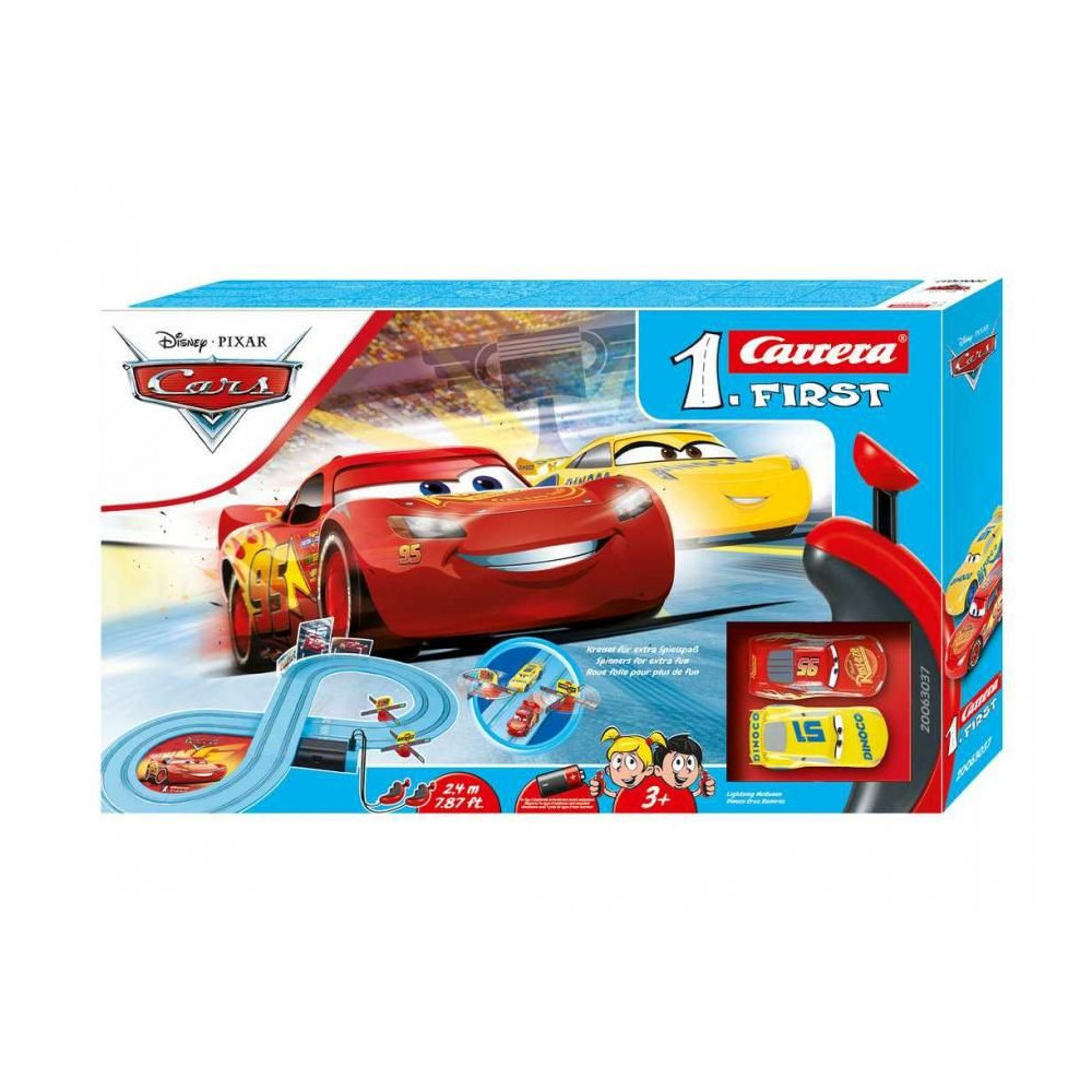 Carrera FIRST 2,4m hosszú, Villám McQueen és Dinoco Cruz autókkal a CARS filmből, 3 éves kortól, elemmel működtethető, egyeneseket, kanyarokat, pörgő kaput, sofőröket és dekorációkat tartalmaz CARS témával.