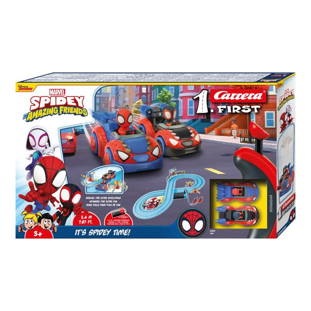 Az ifjú Peter Parker (röviden Pókica) már népszerű szuperhős, de a "Pókica és szuper barátai" című gyermeksorozatban hamar rájön, hogy még könnyebb segíteni az embereken, ha barátok vannak melletted. A Carrera FIRST "It's Spidey Time" szettjében barátja, Miles Morales, azaz Spin csatlakozik hozzá, miközben egy 2,4 méteres pályán versenyez. A 3 éves és idősebb gyerekek egy elemmel működő, propellerekkel felszerelt pályán versenyeznek - a még nagyobb szórakozás érdekében. A pályát számos dekorációs elem díszíti, amelyek igazi Spidey-hangulatot varázsolnak a szobába.