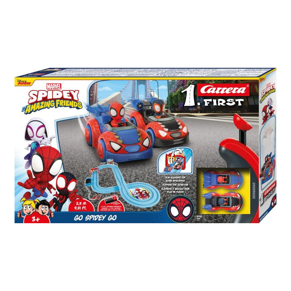 Peter Parker, röviden Pókica, csatlakozik barátjához, Miles Moraleshez - alias Spino - a "Pókica és szuper barátai" sorozatból, és a 2,9 méter hosszú pályán igazán belead a gázpedálba. Az elemmel működő Carrera FIRST versenypálya nagy kihívások elé állítja a fiatal versenyzőket - egyenesekkel, kanyarokkal, pályaszűkületekkel - és rengeteg szórakozással! A szaltón egy szemet gyönyörködtető Póki-dizájn látható egy élénk kék pályán. A sorozat témáit idéző díszítőelemek teszik teljessé a játékélményt.