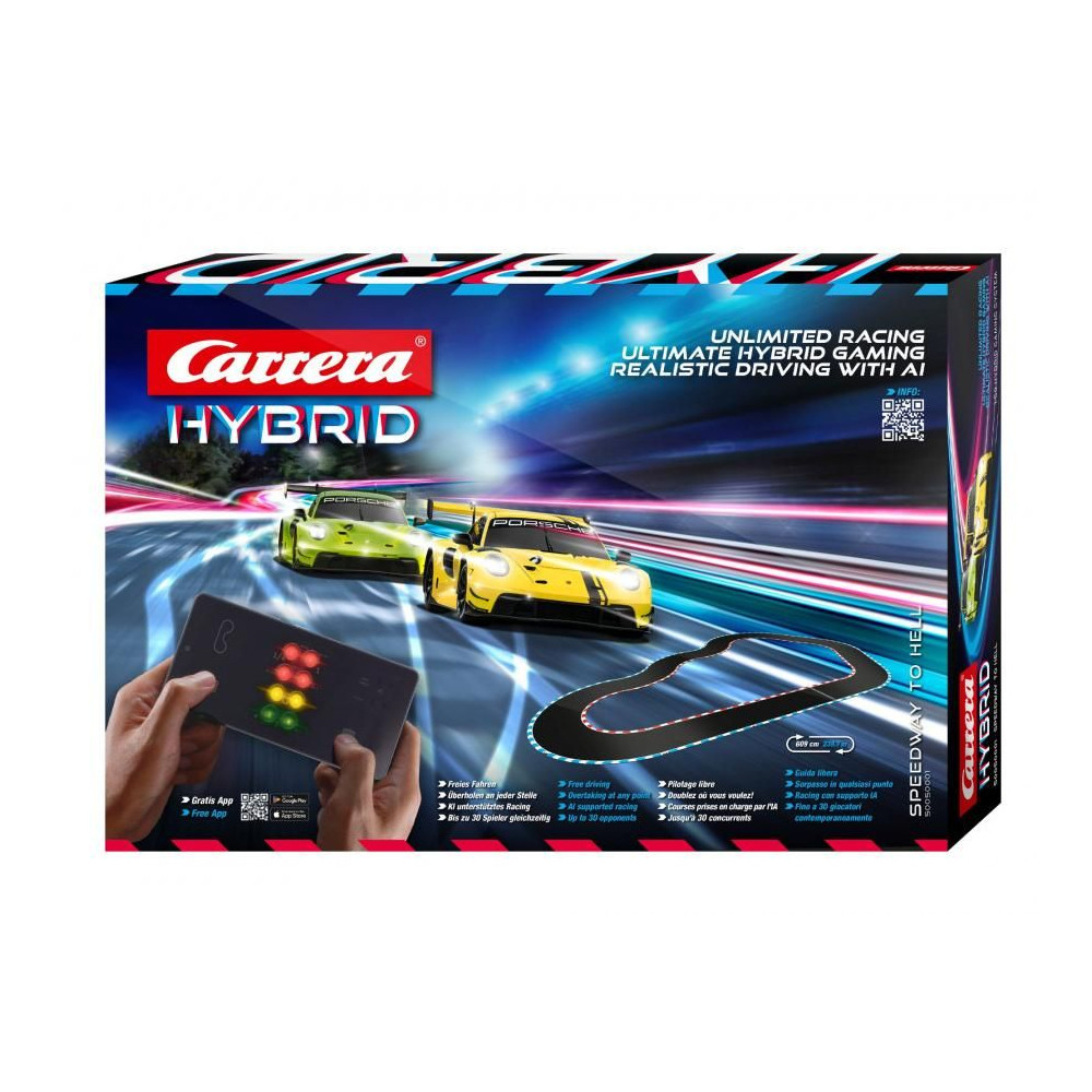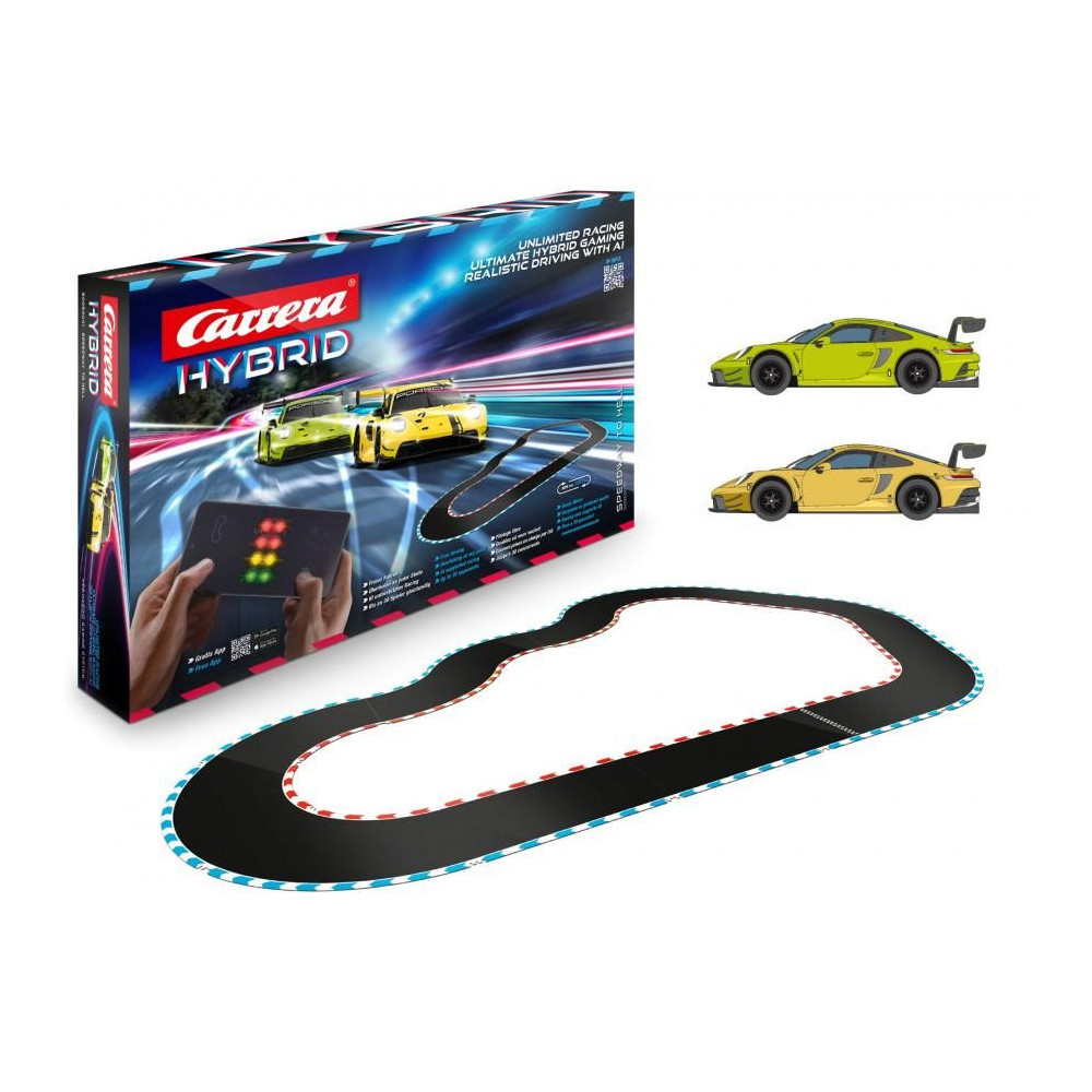 Carrera Hybrid versenypálya, 6,09 m hosszú, Porsche 911-es autókkal, egyenesekkel és kanyarokkal. Pályahossz: 6,09 m. Méretek összeszerelés után: 250 x 172 cm. Az új Carrera - Hybrid versenypálya-család a játék és a versenyzés élményének tökéletes kombinációját kínálja. A mesterséges intelligencia támogatás realisztikus vezetési élményt nyújt különböző vezetési módokban. Irányítás az alkalmazáson keresztül. Vezetés és előzés a pályán és azon kívül. Versenyek akár 16 versenyzővel. Autóbeállítások mesterséges intelligenciával. Autók 1/50 méretarányban. Online versenyzés. Különböző nehézségi szintek feloldása. A csomag tartalma: 2x Porsche 911 GT3 autó Egyenesek, kanyarok Carrera Hybrid - 16 autó számára lehetővé teszi, hogy a pályára és a pályáról letérjen, és egymást megelőzzék 1:50-es autó méretarány Akár 16 pilóta is vezethet ezen a pályán egyszerre Akár 30 pilóta is versenyezhet Online vezérlés a Carrera alkalmazással Előzés egyenesekben, kanyarokban és pályáról letérve Minden autó egyedi beállítása mesterséges intelligencia segítségével Az alkalmazás dizájnja valódi versenyautók pilótafülkéjén alapul Széles pálya, autentikus motorhangok Különböző nehézségi szintek A pálya könnyen szétszerelhető és összeszerelhető Kiváló minőségű kidolgozás 12 éves kortól mindenkinek alkalmas A CARRERA spanyolul versenyzést jelent, és egy dolgot garantálhatunk. Amint kicsomagolod a Carrera logós dobozt, a versenyzői vér a legnagyobb sebességre fog pumpálódni, és nem számít, melyik pályán vagy melyik autóval versenyzel. Ezt az érzést több ezer rajongó tapasztalta meg 1963 óta, amikor a Carrera megalapította első versenypályáját. Az elkövetkező negyven évben a Carrera a versenypályák, autók és tartozékaik területén a csúcsra emelkedett. Ma már kiváló minőségű termékeket kínál, amelyek nemcsak gyerekeknek, hanem felnőtteknek is szólnak, akik számára a versenypályák élethosszig tartó hobbivá váltak.
