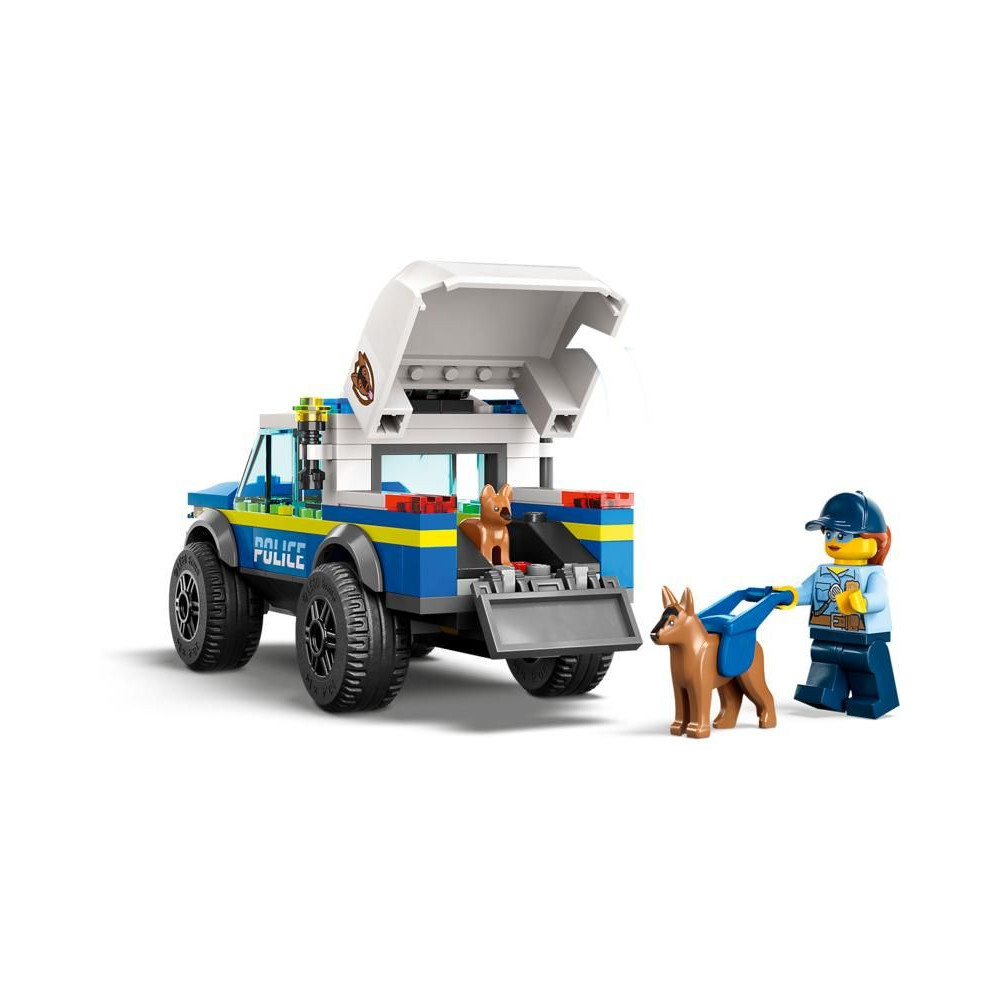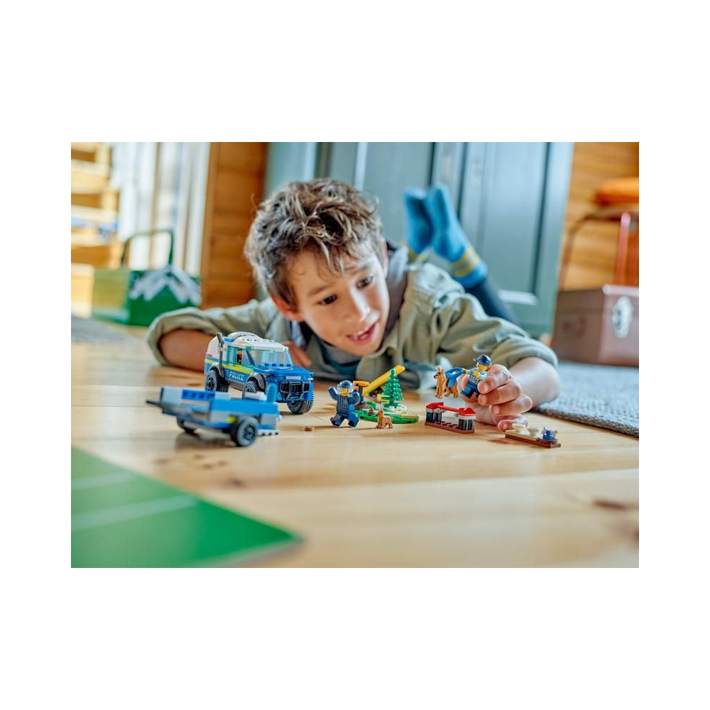 - Mit találnak a gyerekek a dobozban? - Minden, amire a gyerekeknek szükségük van egy rendőrségi terepjáró, utánfutó és kiképzési akadályok megépítéséhez, valamint 2 minifigura, egy kutyafigura és egy kölyökkutya figura.