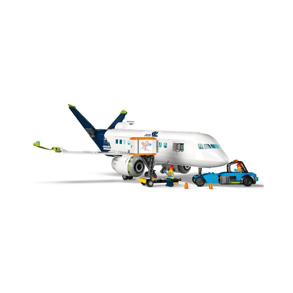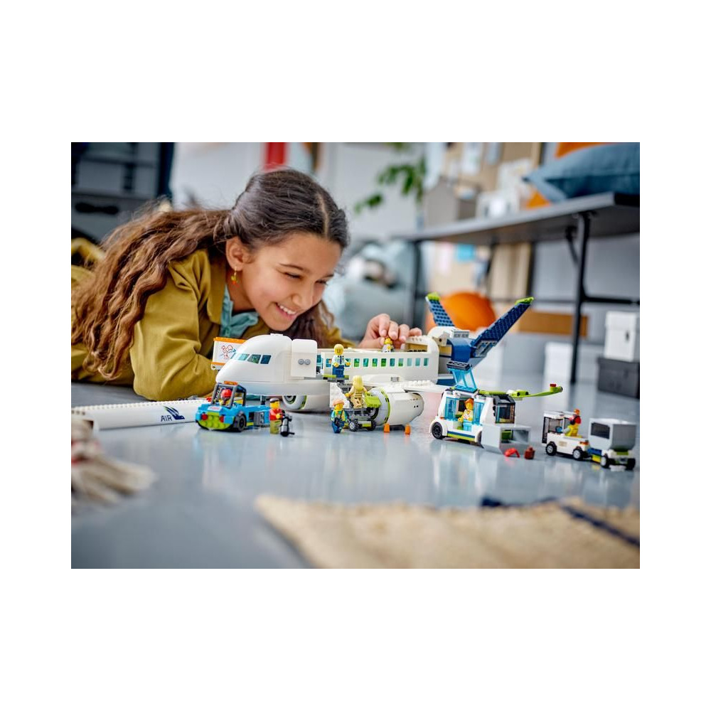 A LEGO® City Passenger Plane készlet 7 éves kortól tartalmaz egy reptéri buszt, egy repülőgépvontatót, egy büfékocsit, egy csomagszállító kocsit és 9 minifigurát.