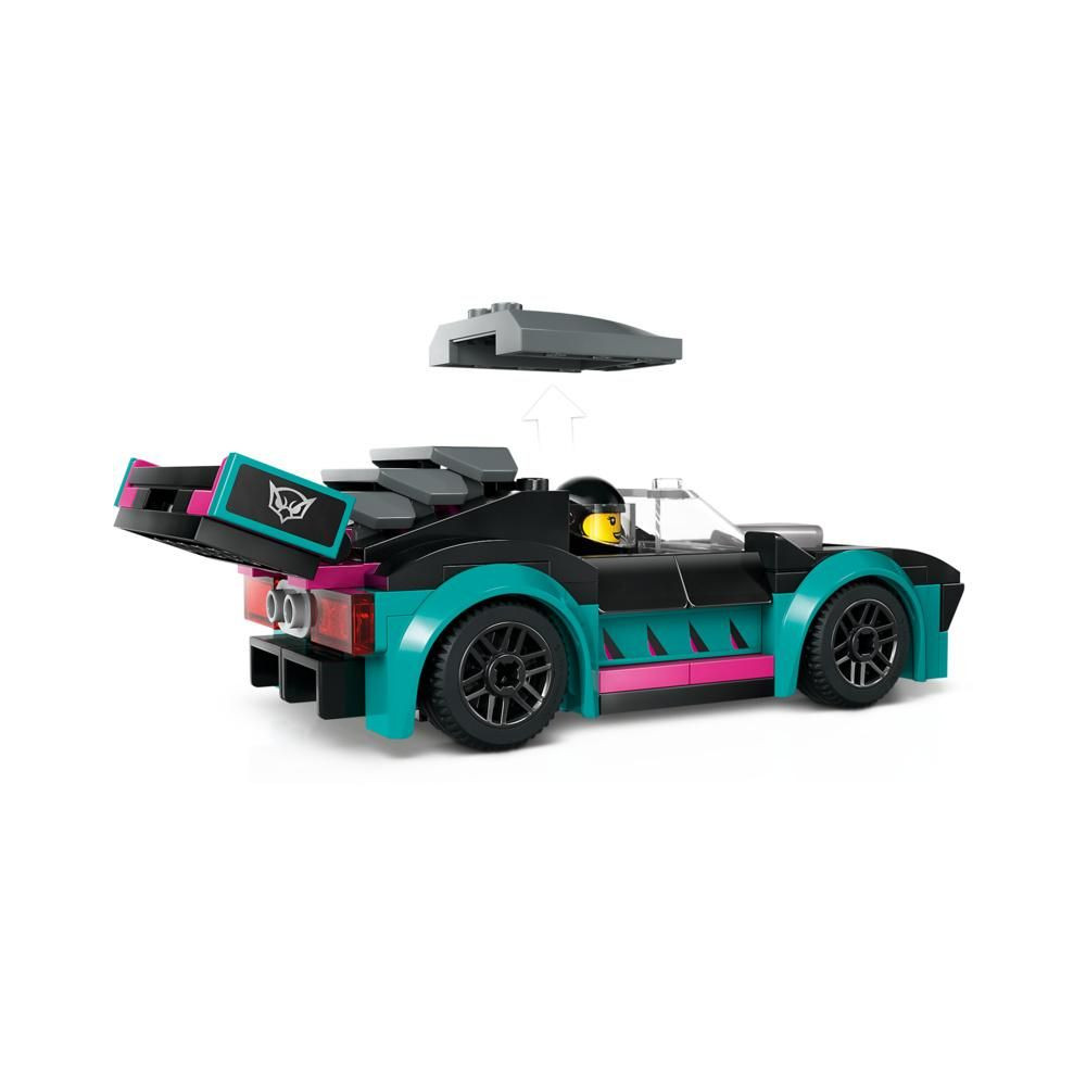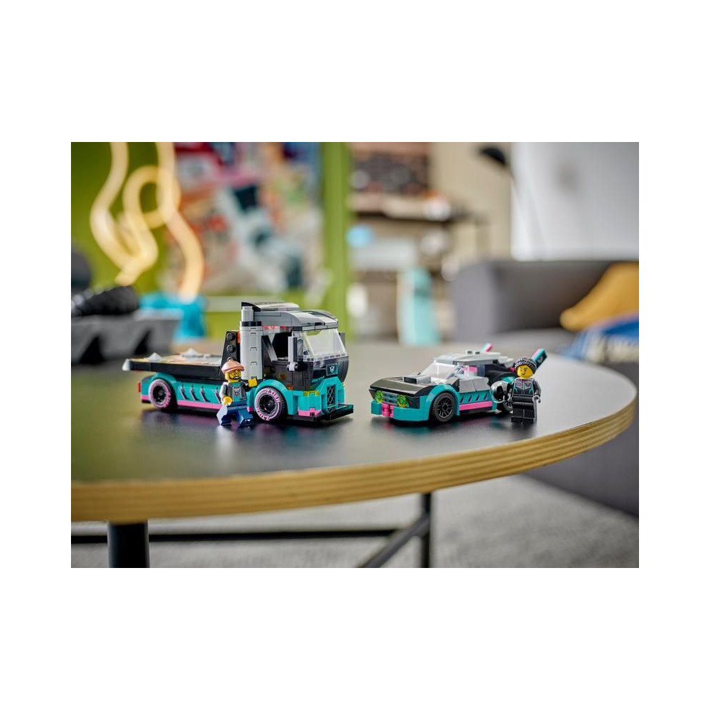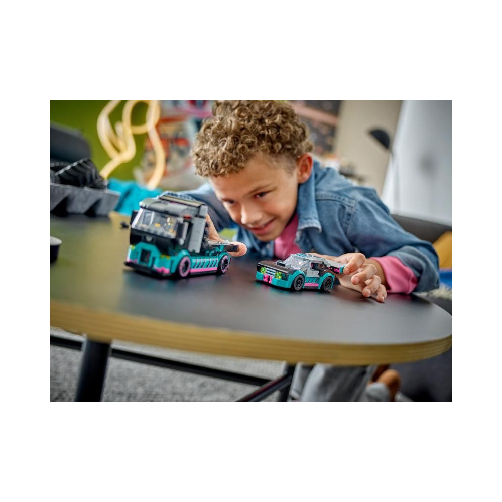 - LEGO® téglából épített teherautó modell - A gyerekek kicsúsztatják a teherautó rámpáját, felpakolják a versenyautó modellt, és elindulnak a legközelebbi versenypályára, hogy akciódús teherautó- és versenyautó-versenyeket rendezzenek.