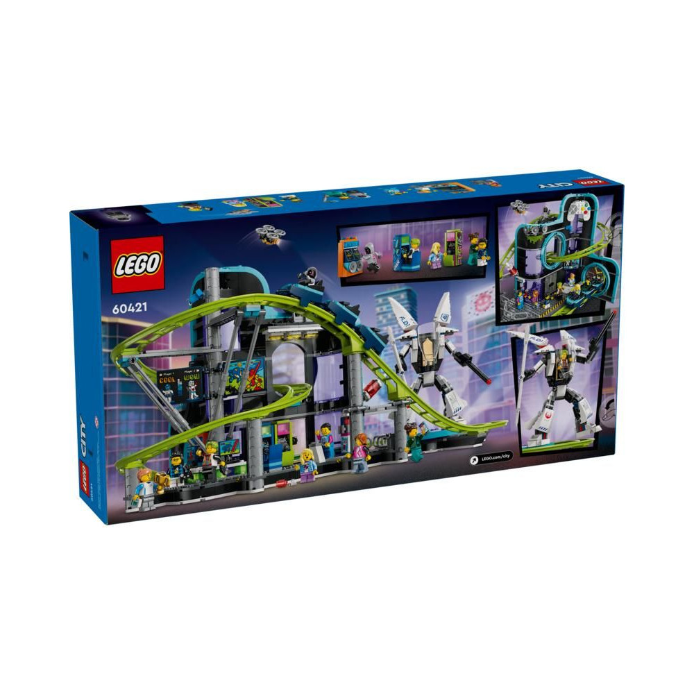 A kis videojáték- és vidámparkrajongók imádni fogják ezt a funkcionális hullámvasútmodellt. A kalandos LEGO® City (60421) Robotic World témapark tele van olyan részletekkel, amelyek órákig tartó fantáziadús játékra inspirálnak. A gyerekek egy háromkocsis vonattal száguldanak át egy futurisztikus, videojátékok témájú környezeten, ahol találnak egy konzolos játéktermet, egy e-sport arénát, egy jégkrémbárt és rengeteg más részletet. A készlet tartalmaz egy mozgó robotruhát és 8 minifigurát is a karakteres játékhoz és a meséléshez.