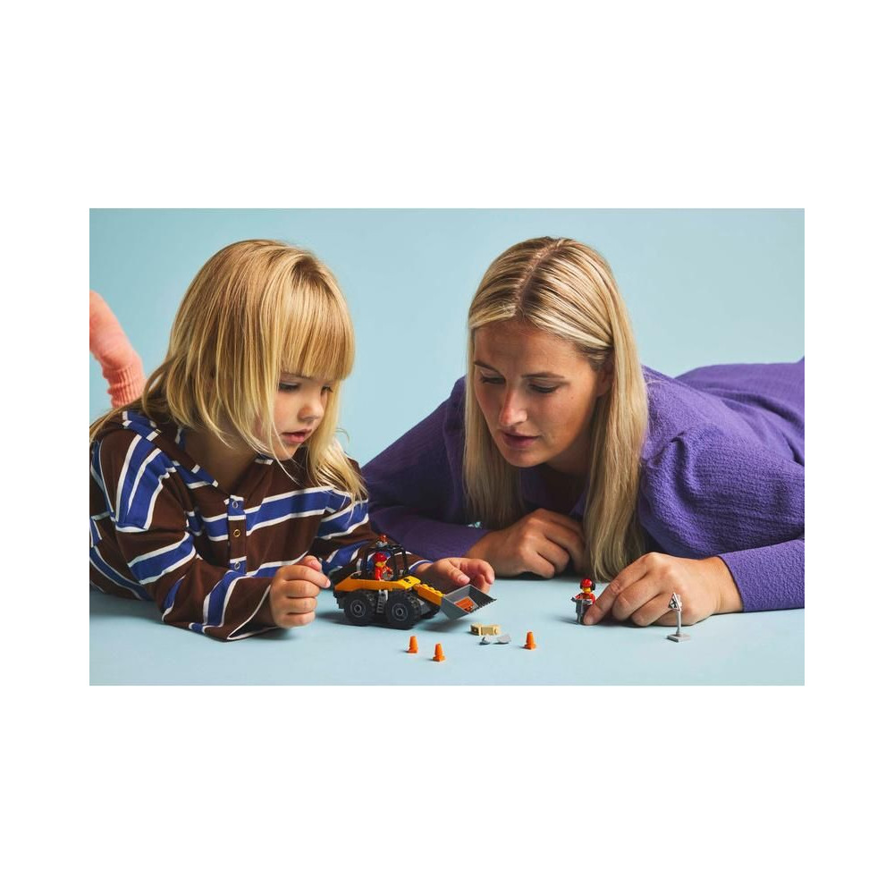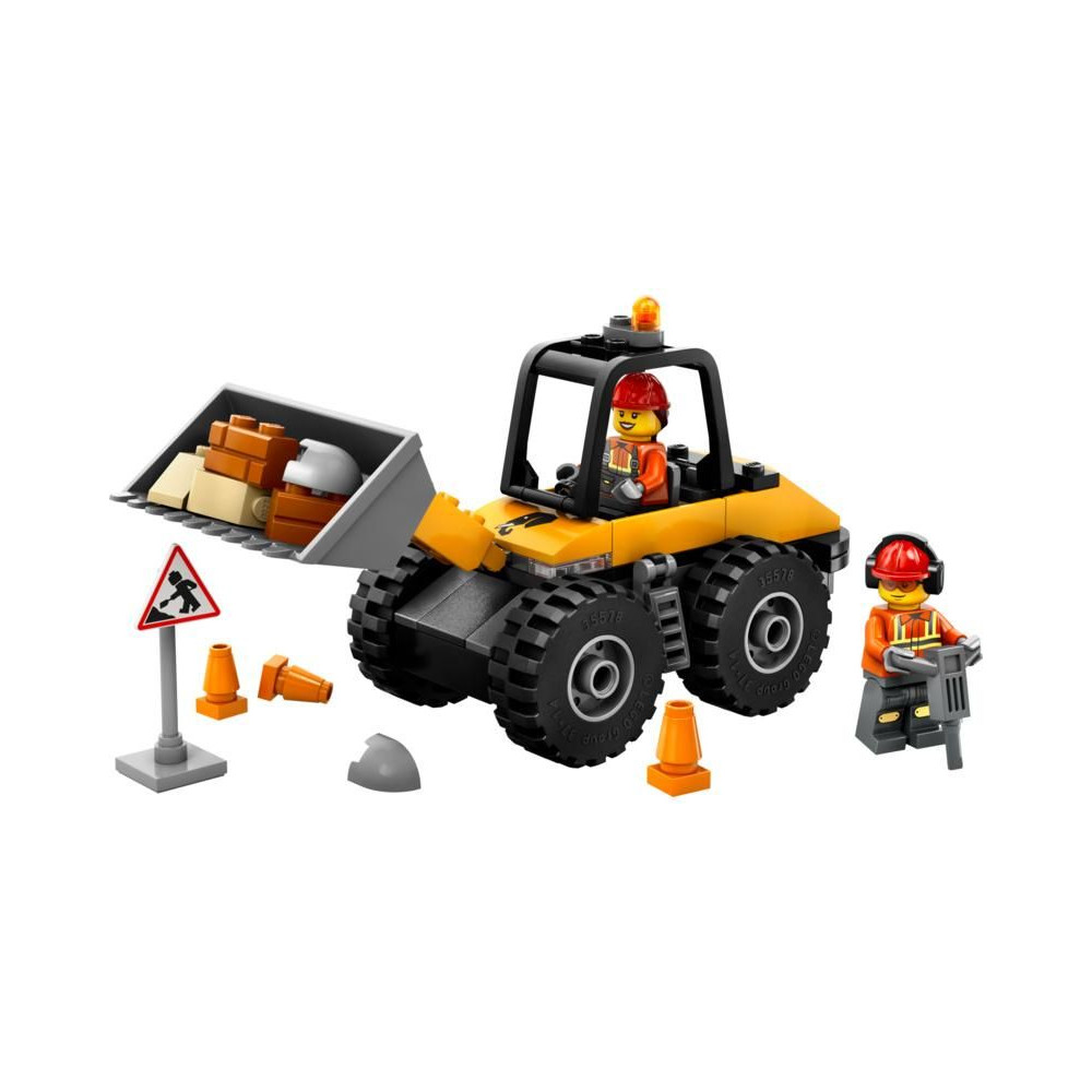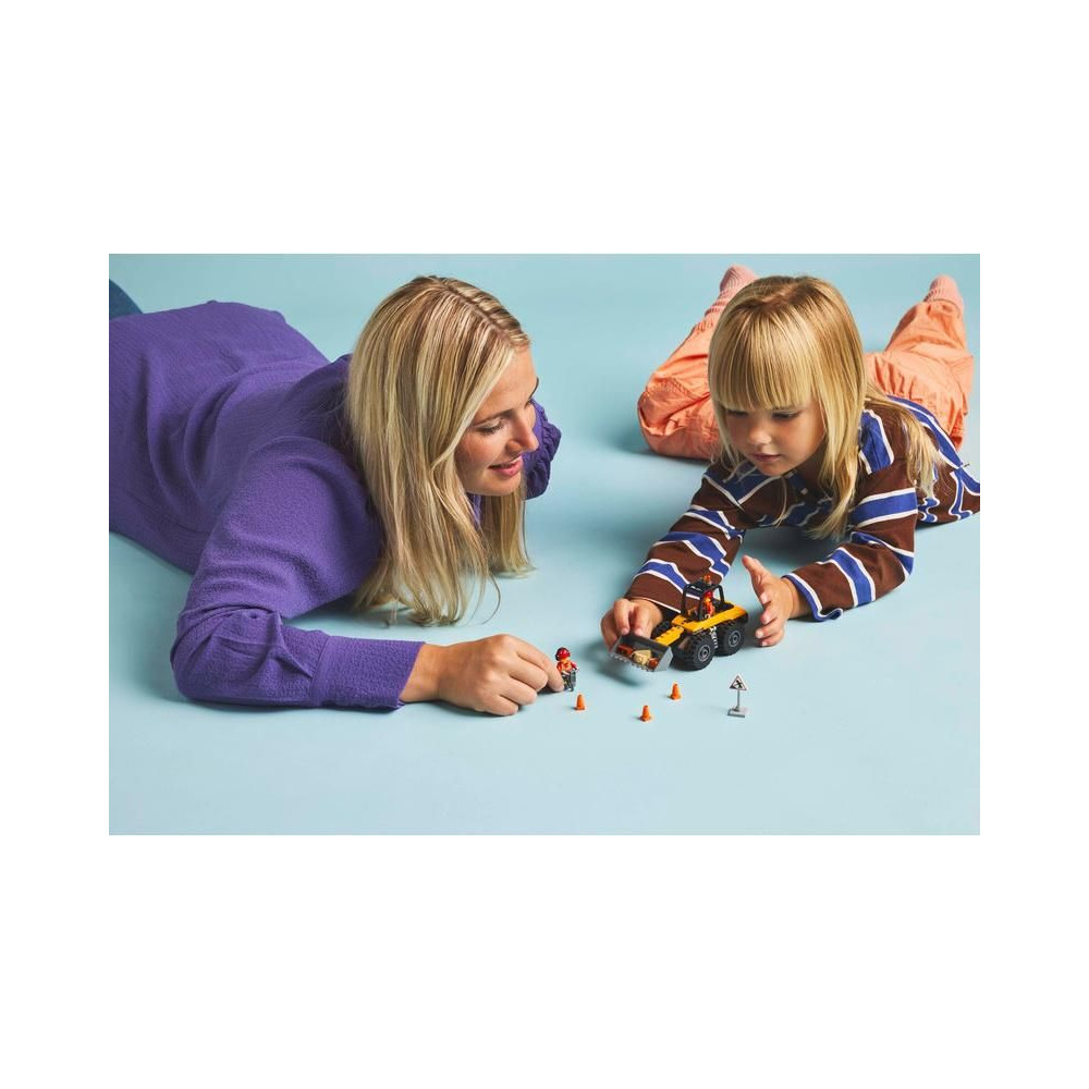 - Mit találsz a dobozban? – Az építőkészlet tartalmaz egy megépíthető kerekes rakodógép modellt, egy sofőr és egy munkás minifiguráját, egy közlekedési táblát, közlekedési bójákat és egy légkalapácsot