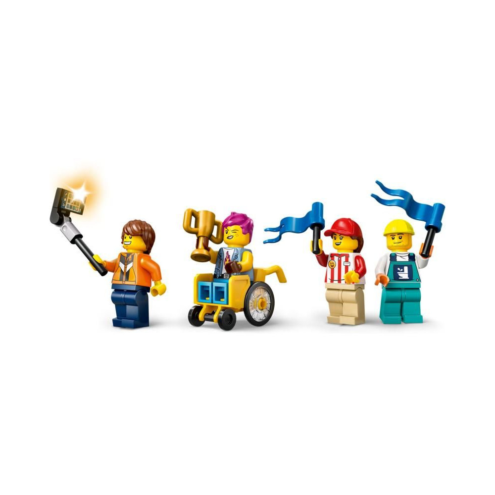 - LEGO® Minifigura kiegészítők – Ez a verseny miniautó készlet számos kiegészítőt tartalmaz, többek között egy kerekesszéket, egy győztesnek járó trófeát, egy szelfibotot és egy szerelő szerszámosládáját.