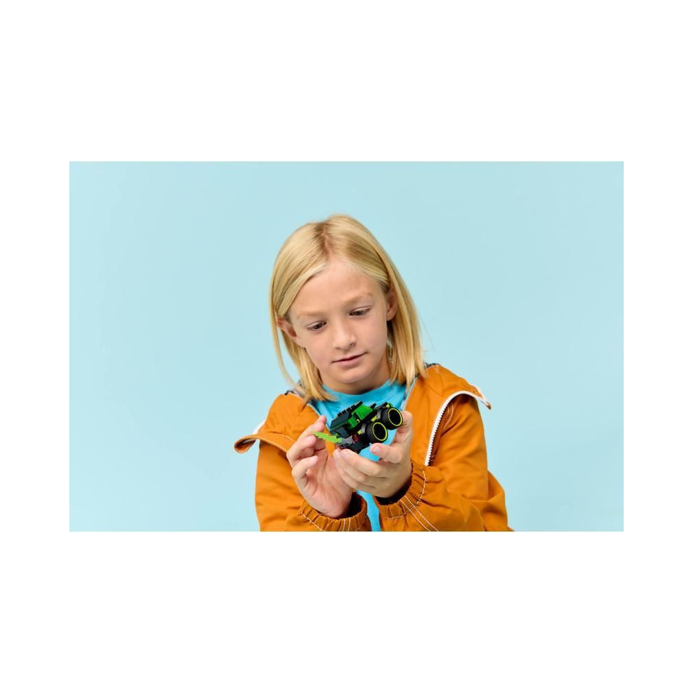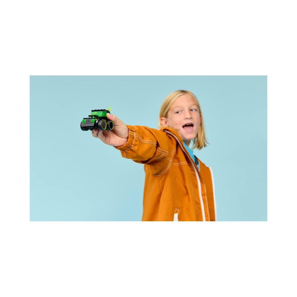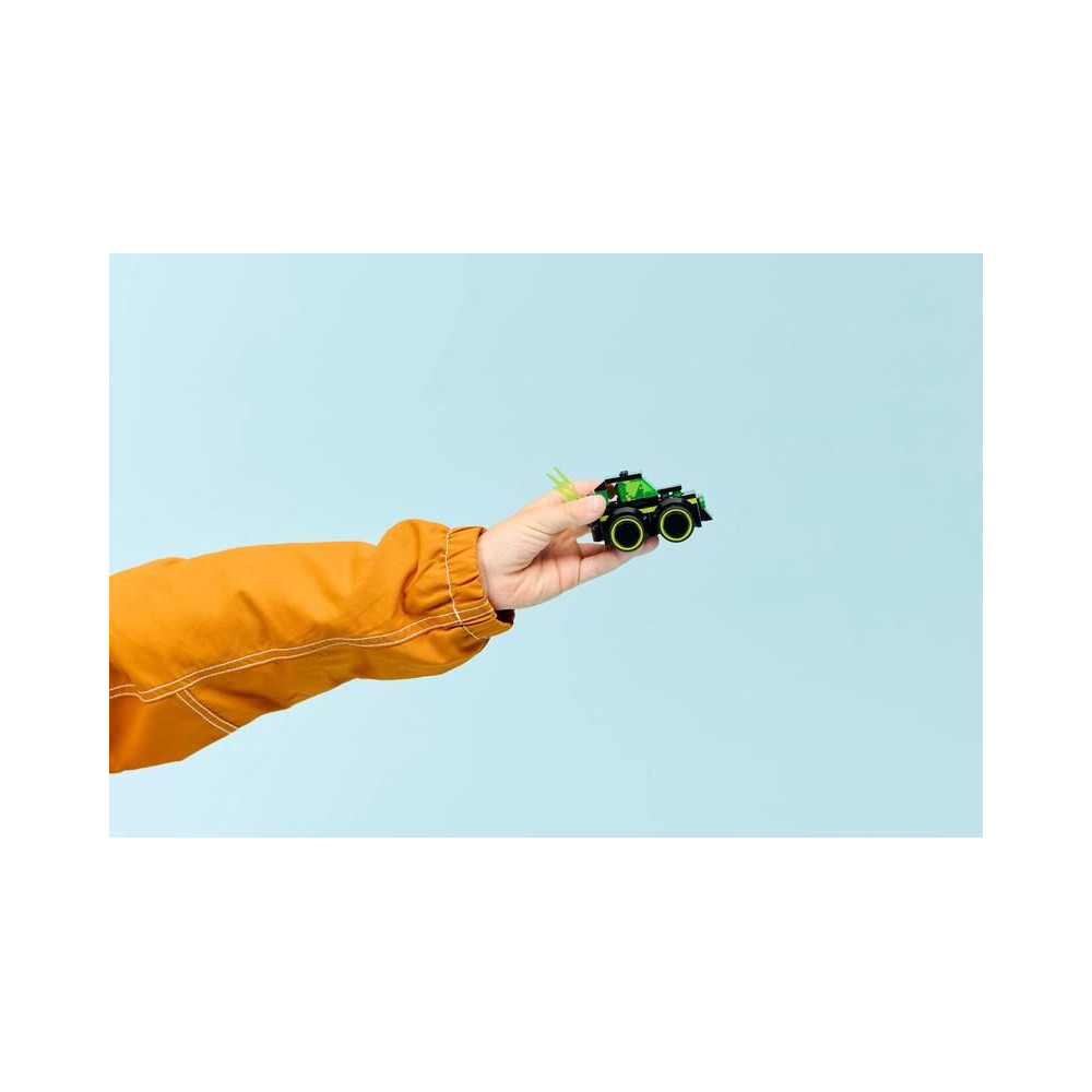- MINI AUTÓ A KREATÍV SZÓRAKOZÁSHOZ - Ikonikus játékautó-dizájn neon mintával, óriási gumiabroncsokkal, vezetőfülkével és lángoló kipufogóval a fantáziadús játékhoz
