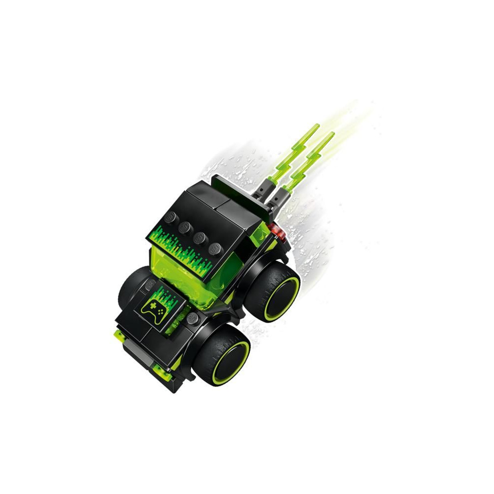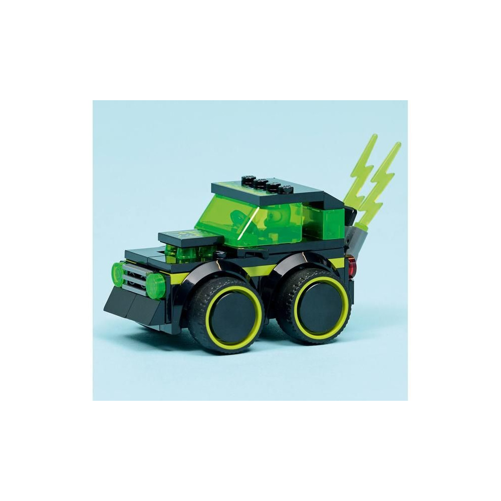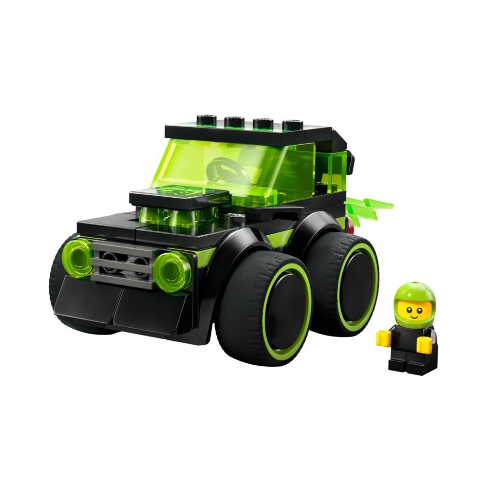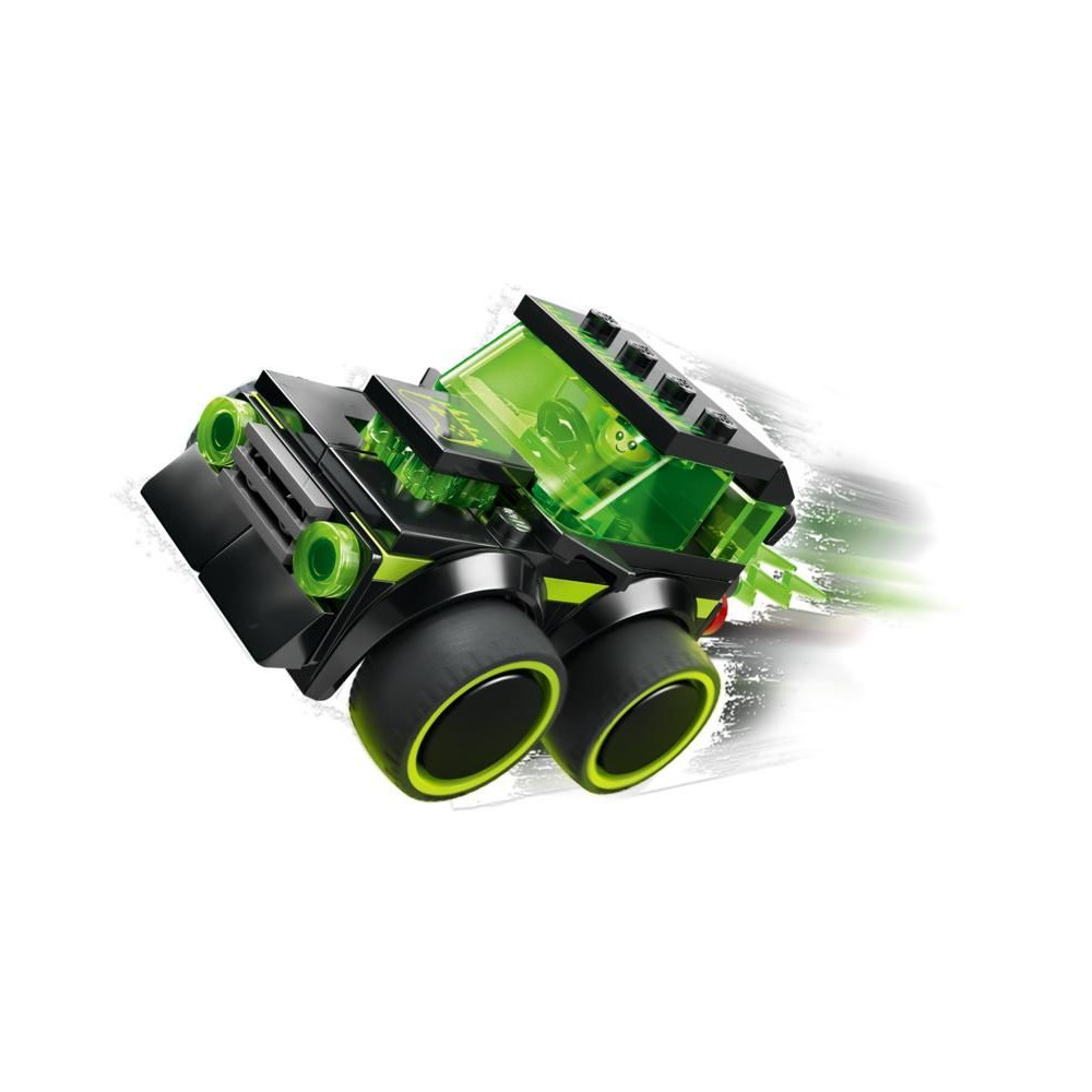 - MINI AUTÓ A KREATÍV SZÓRAKOZÁSHOZ - Ikonikus játékautó-dizájn neon mintával, óriási gumiabroncsokkal, vezetőfülkével és lángoló kipufogóval a fantáziadús játékhoz