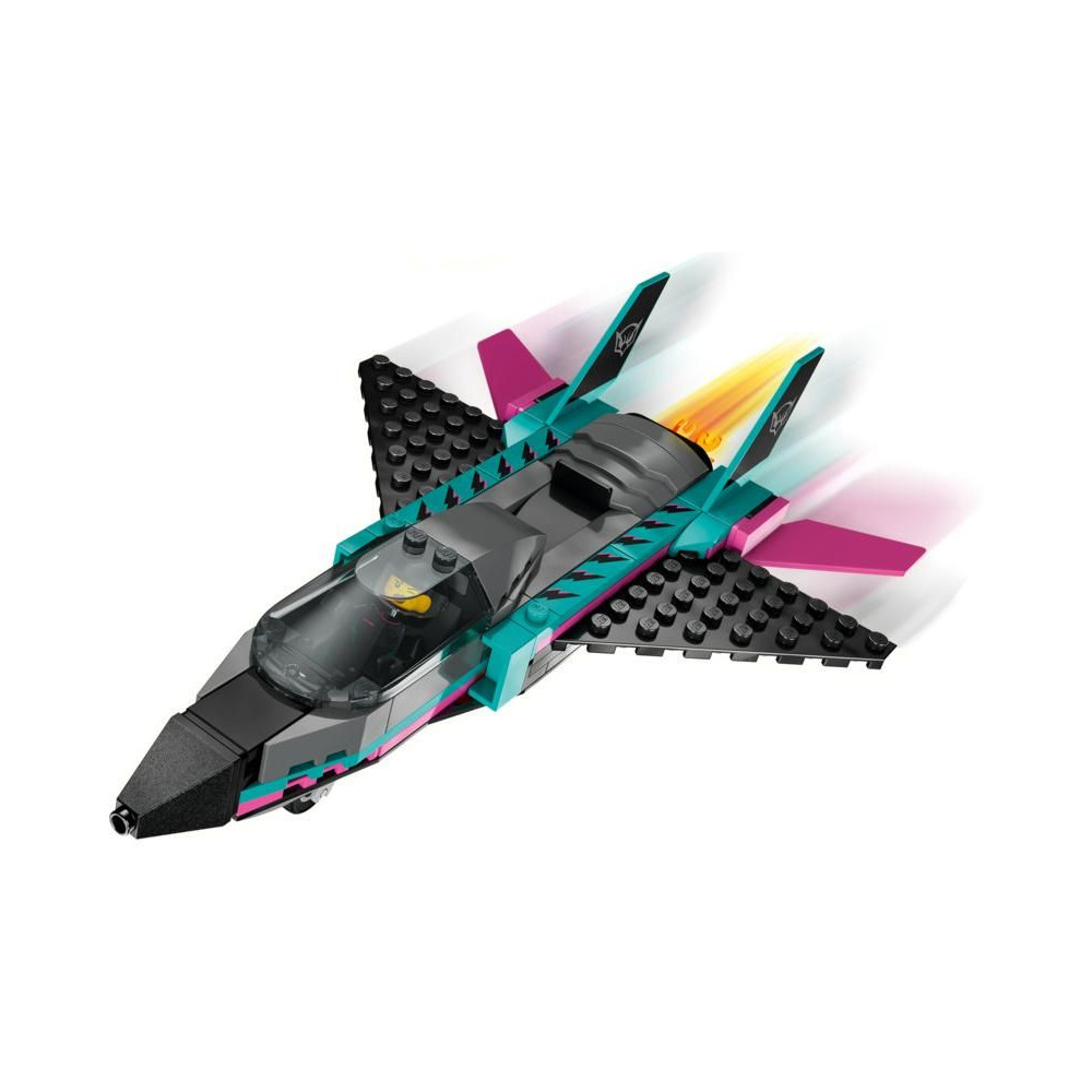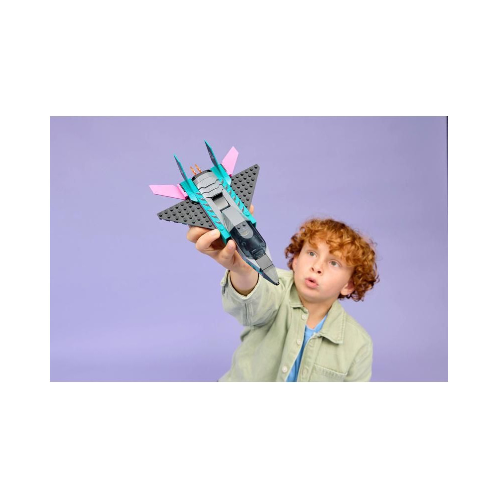 A LEGO® City Sugárhajtású repülőgép vs. autó (60489) dupla készlet egy elegáns szuper sportautót és egy szuperszonikus repülőgépet tartalmaz, amelyekkel a kis építők órákon át tartó versenyzésben lesznek részesei. A sugárhajtású modell nyíl alakú profilú szárnyakkal, dupla függőleges csűrőkkel és vezérsíkokkal rendelkezik. A gyerekek a kar csúsztatásával bekapcsolhatják a sugárhajtású utánégetőjét, és kinyithatják a szuper sportautó pilótafülkéjét, hogy felfedezzék a kidolgozott belső teret a versenyüléssel. Helyezd el a pilóta és a versenyző minifiguráját, és kezdj el izgalmas versenyeket.