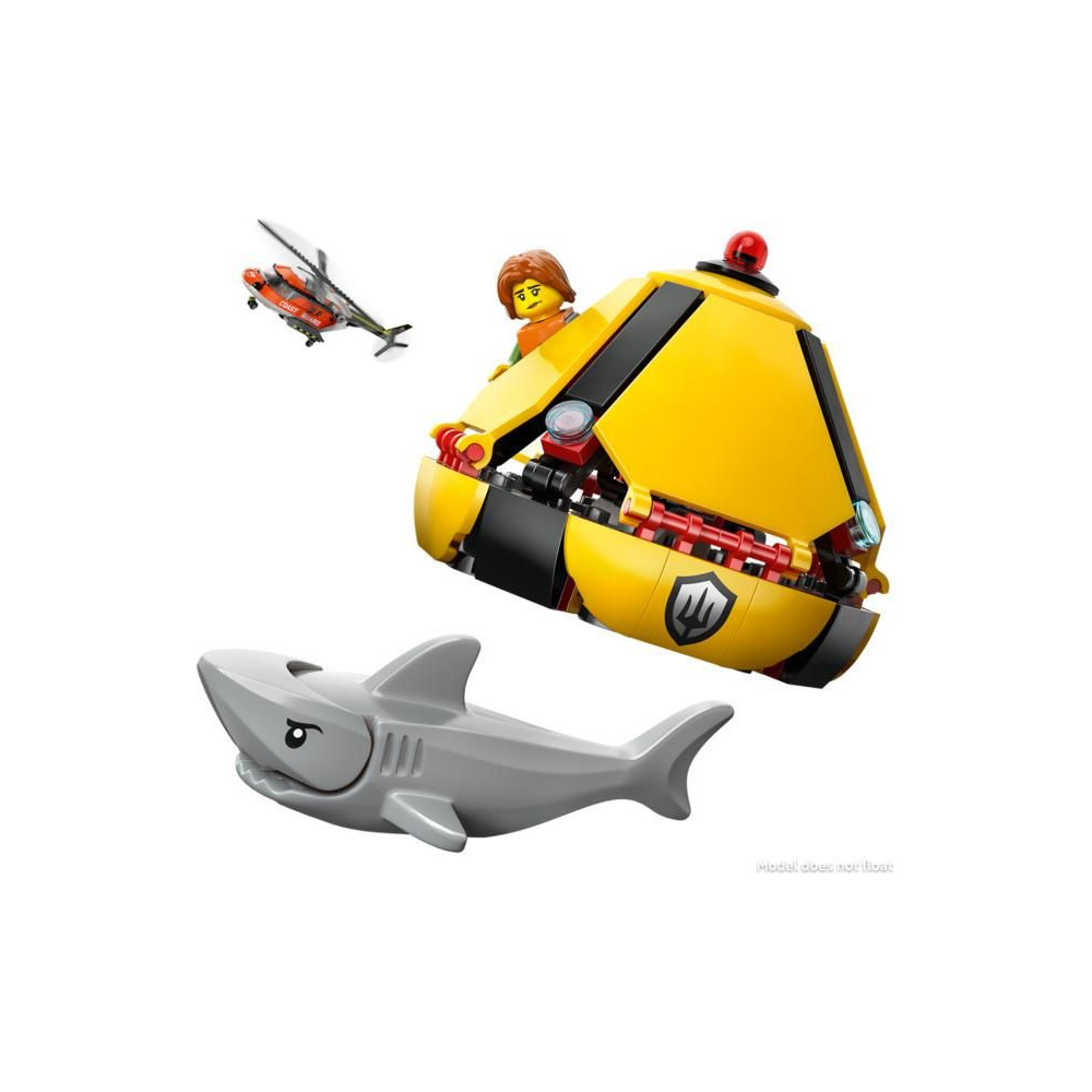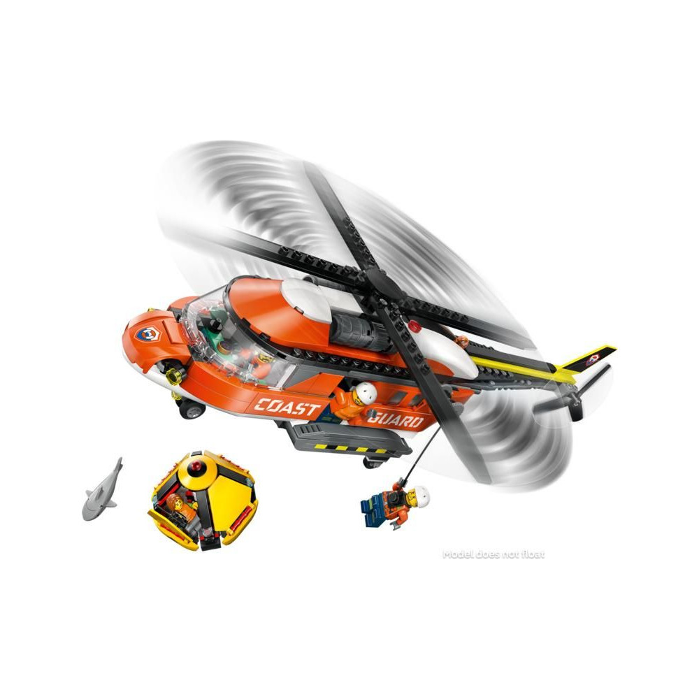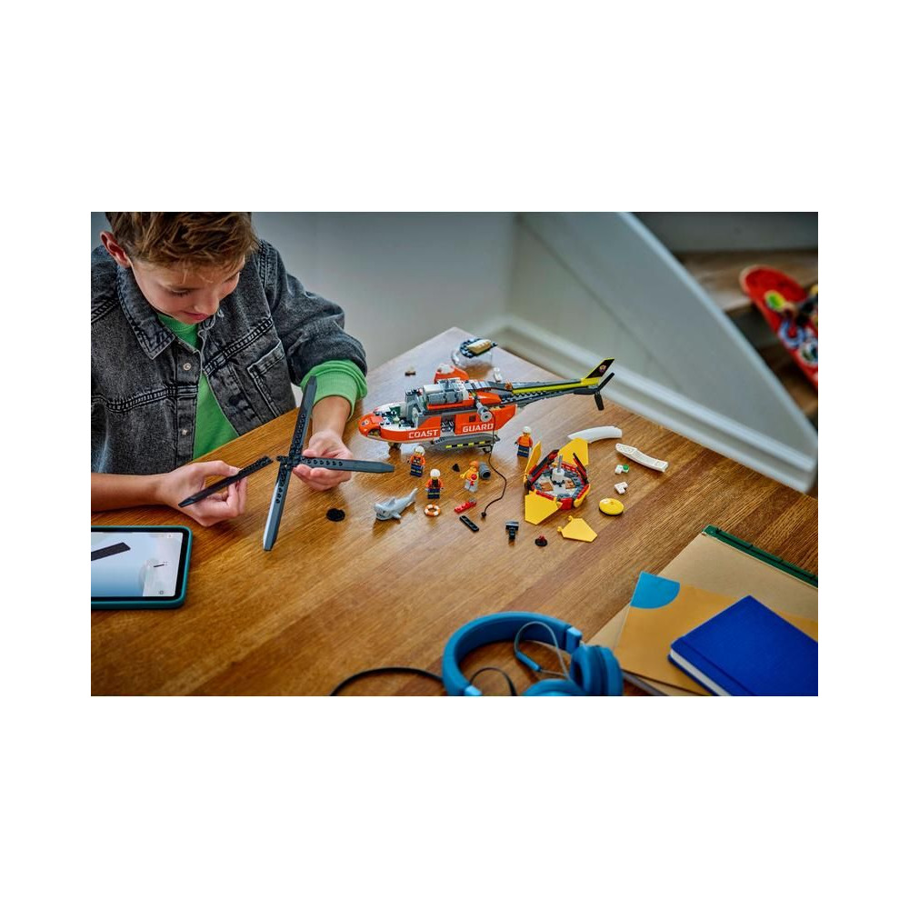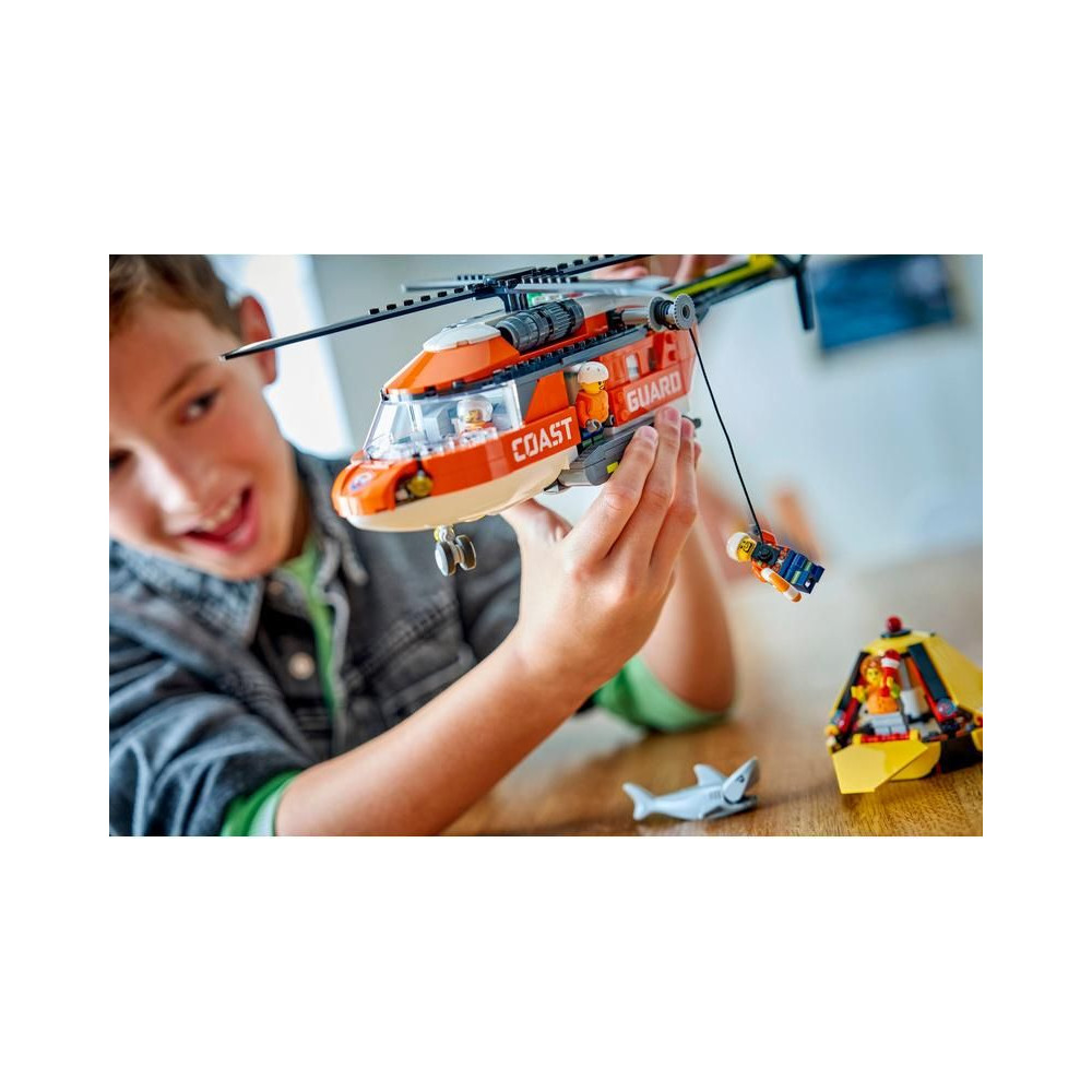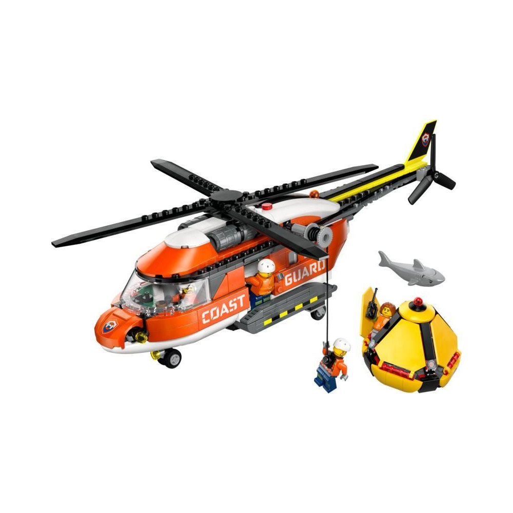 - A DOBOZ TARTALMA – Minden, amire a gyerekeknek szükségük van egy részletesen kidolgozott mentőhelikopter és mentőkapszula játék megépítéséhez, plusz egy pilóta, egy civil és 2 parti őrség minifigura és egy cápafigura