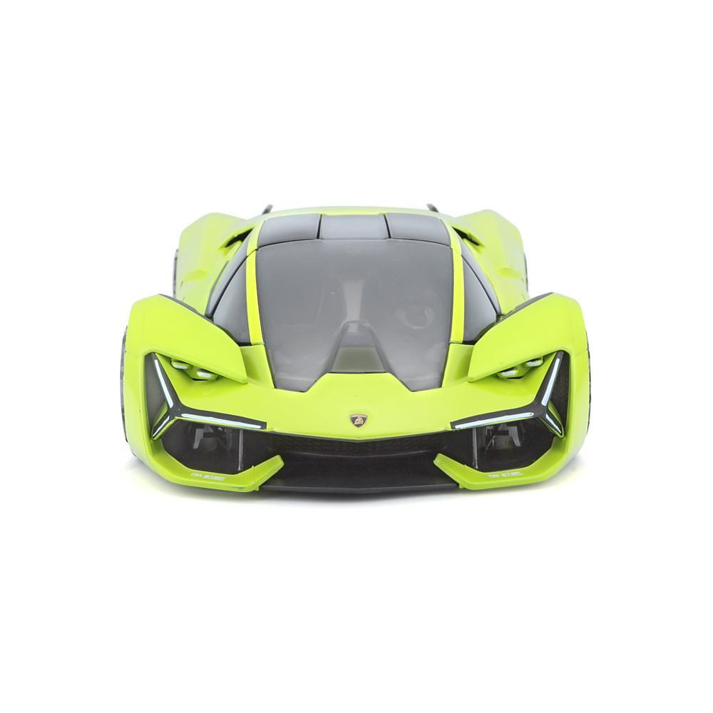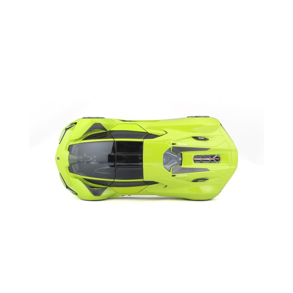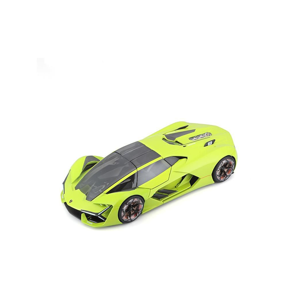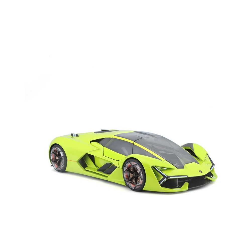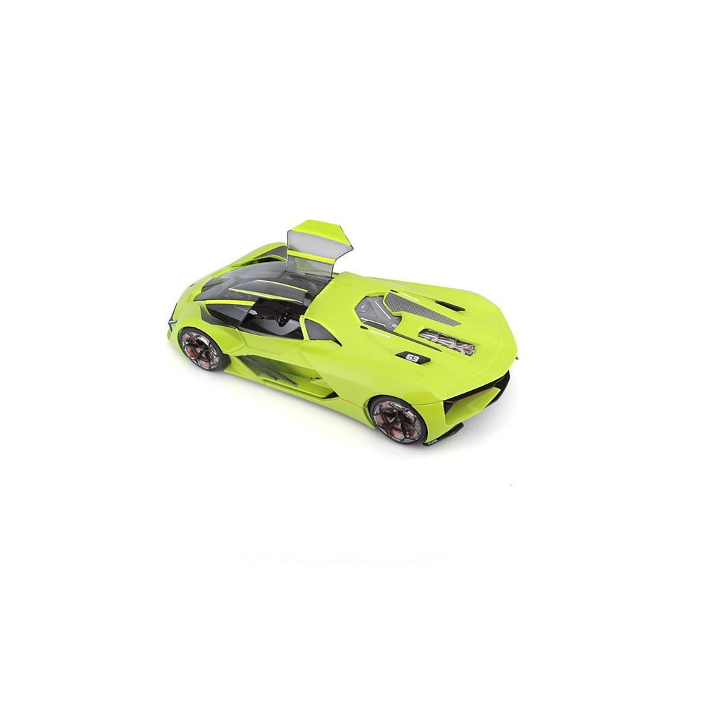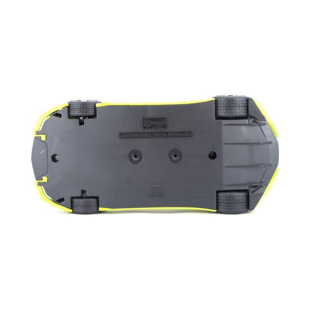Az 1:24 Bburago 18-21094 Plus Lamborghini Terzo Millennio fém autómodell nem csak gyűjtőknek való. Nyitható ajtókkal és motorháztetővel rendelkezik, a kormánykerék forgása teljesen működőképes. A modell színe zöld színű.