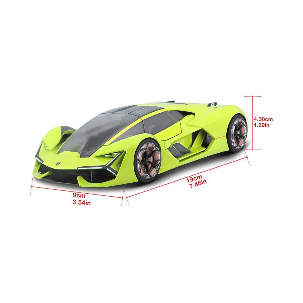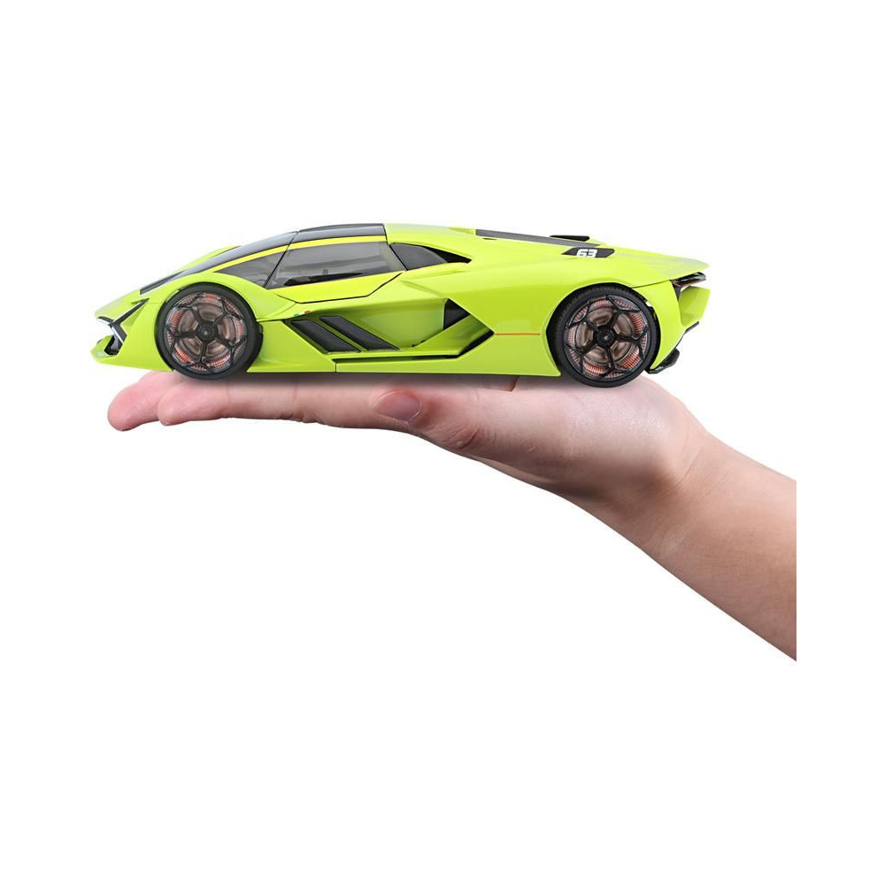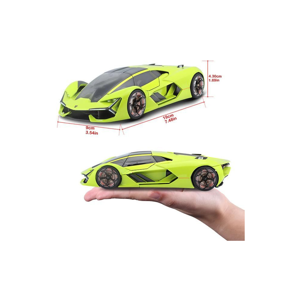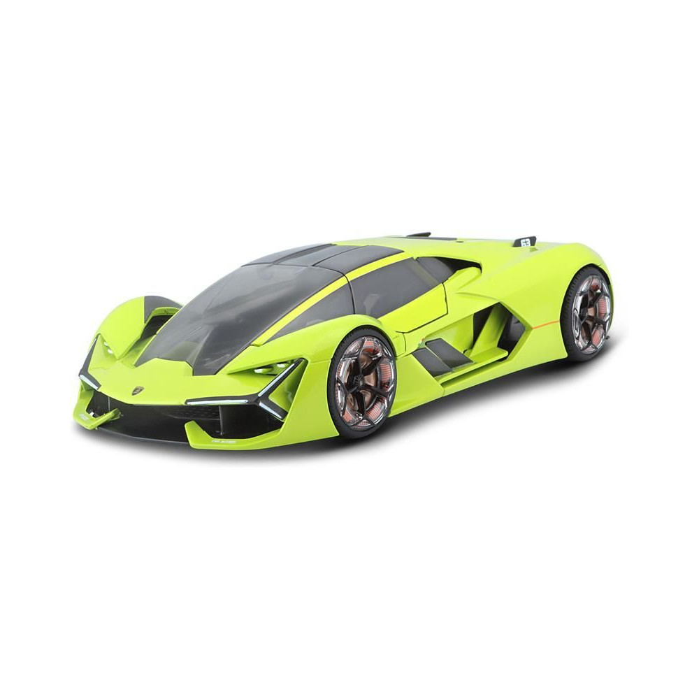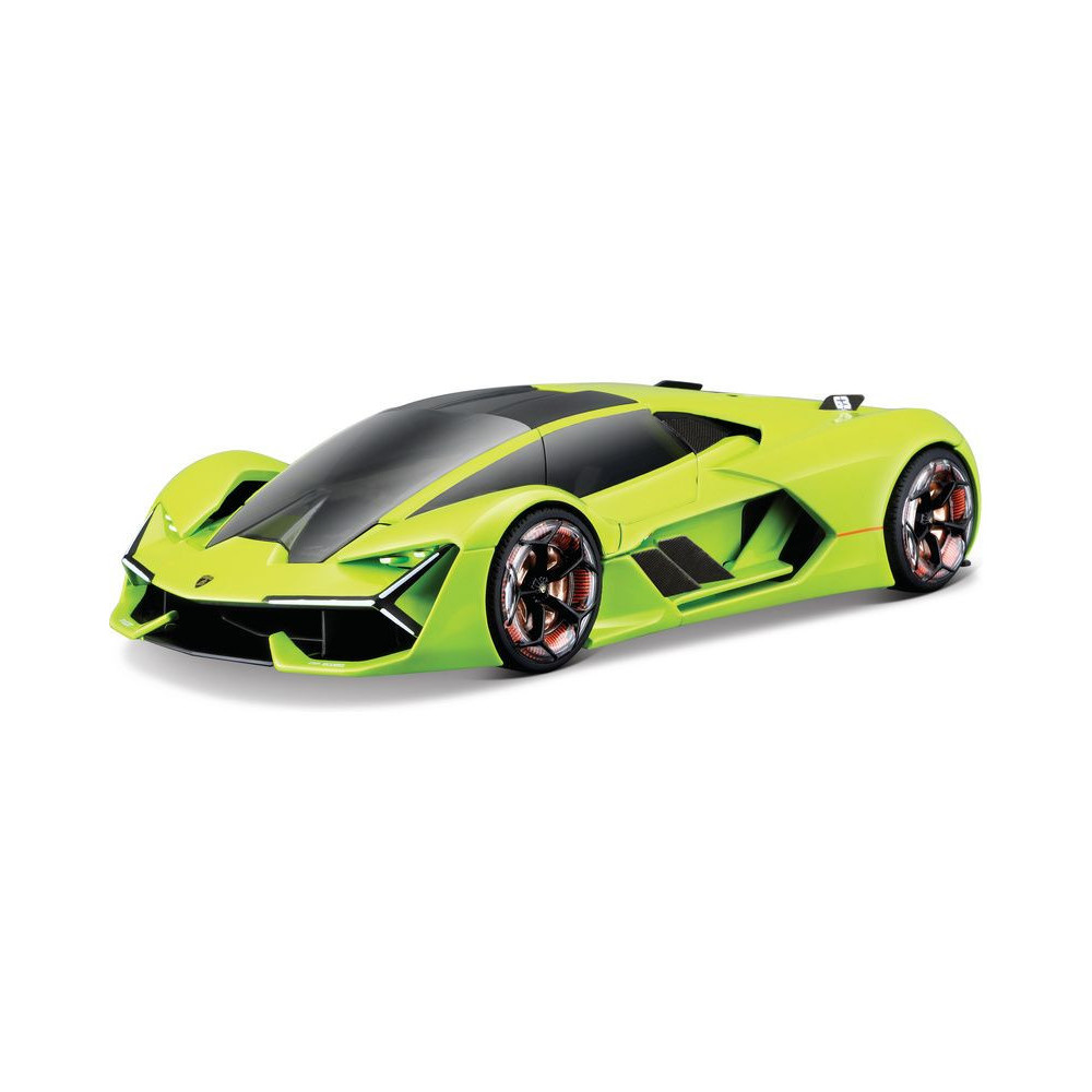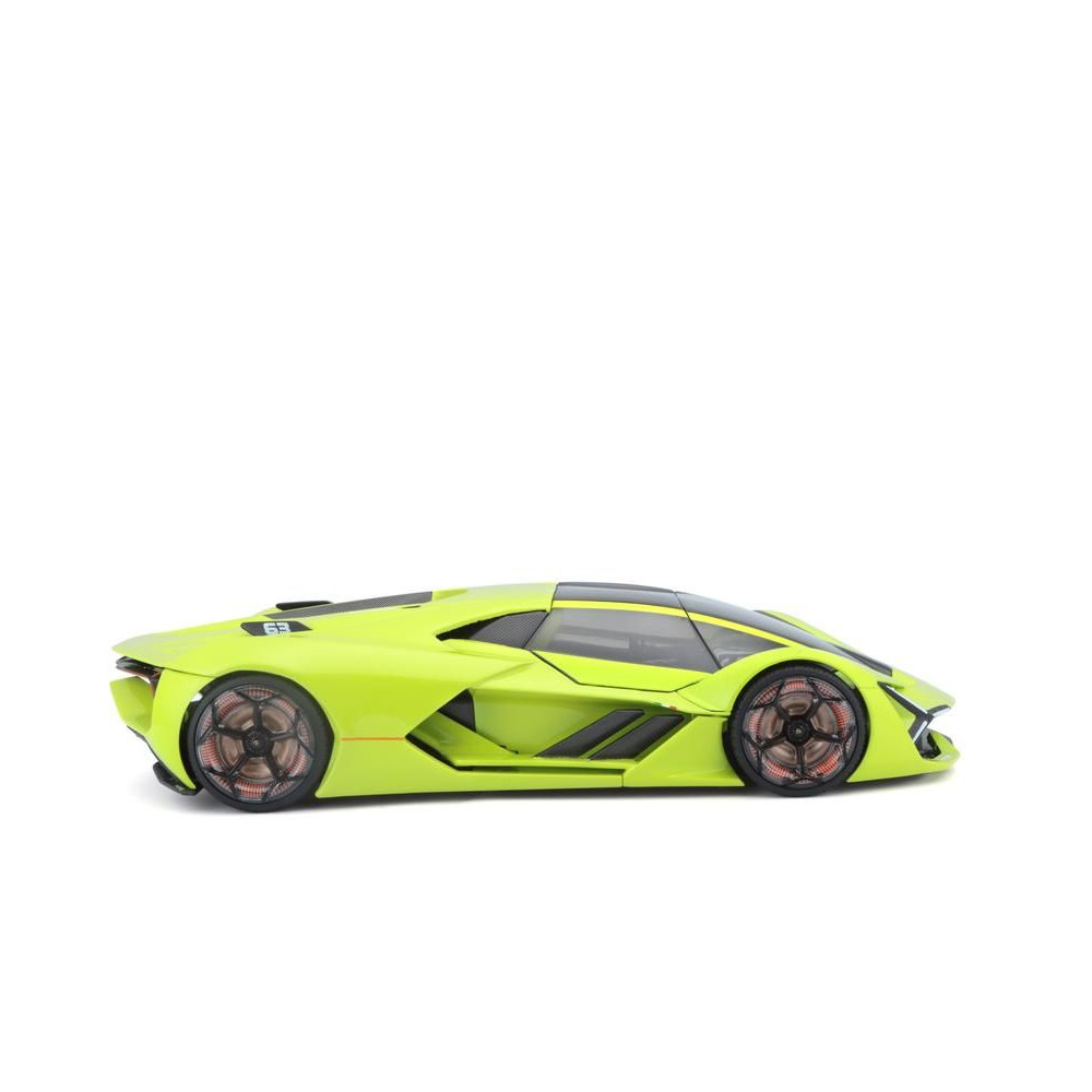 Az 1:24 Bburago 18-21094 Plus Lamborghini Terzo Millennio fém autómodell nem csak gyűjtőknek való. Nyitható ajtókkal és motorháztetővel rendelkezik, a kormánykerék forgása teljesen működőképes. A modell színe zöld színű.