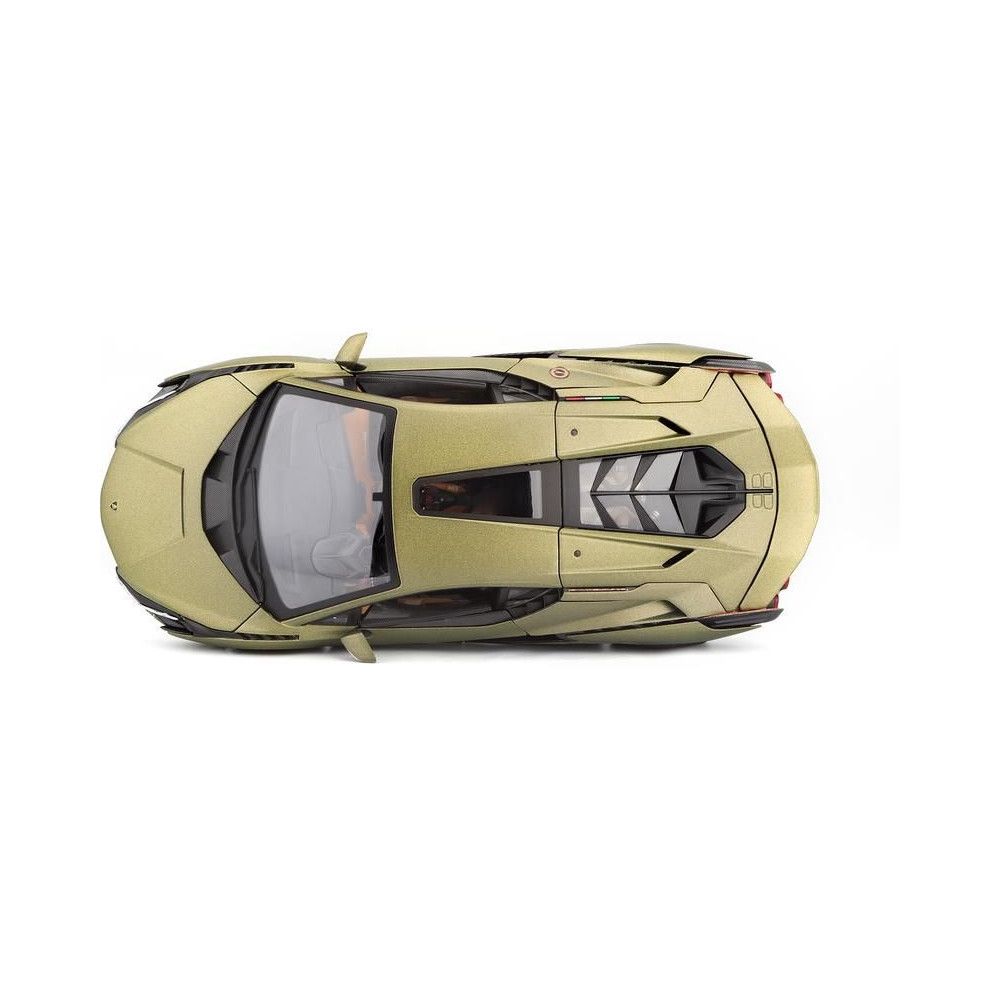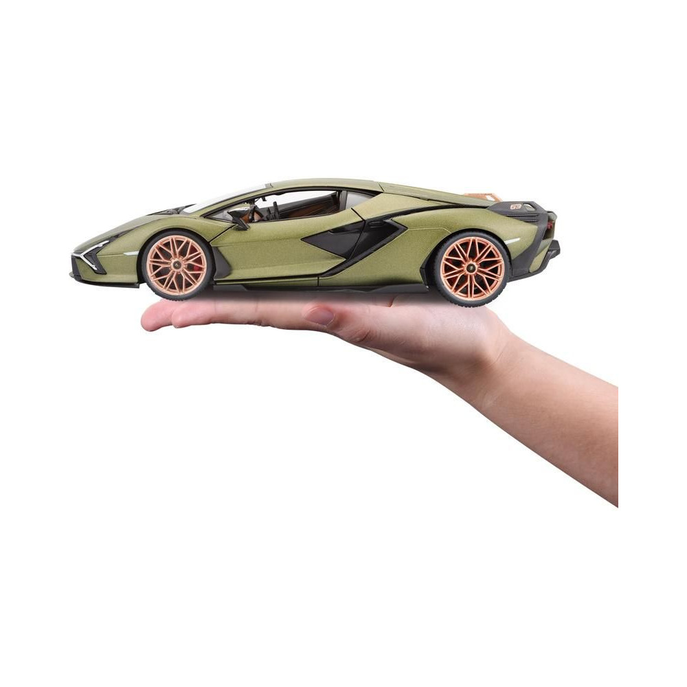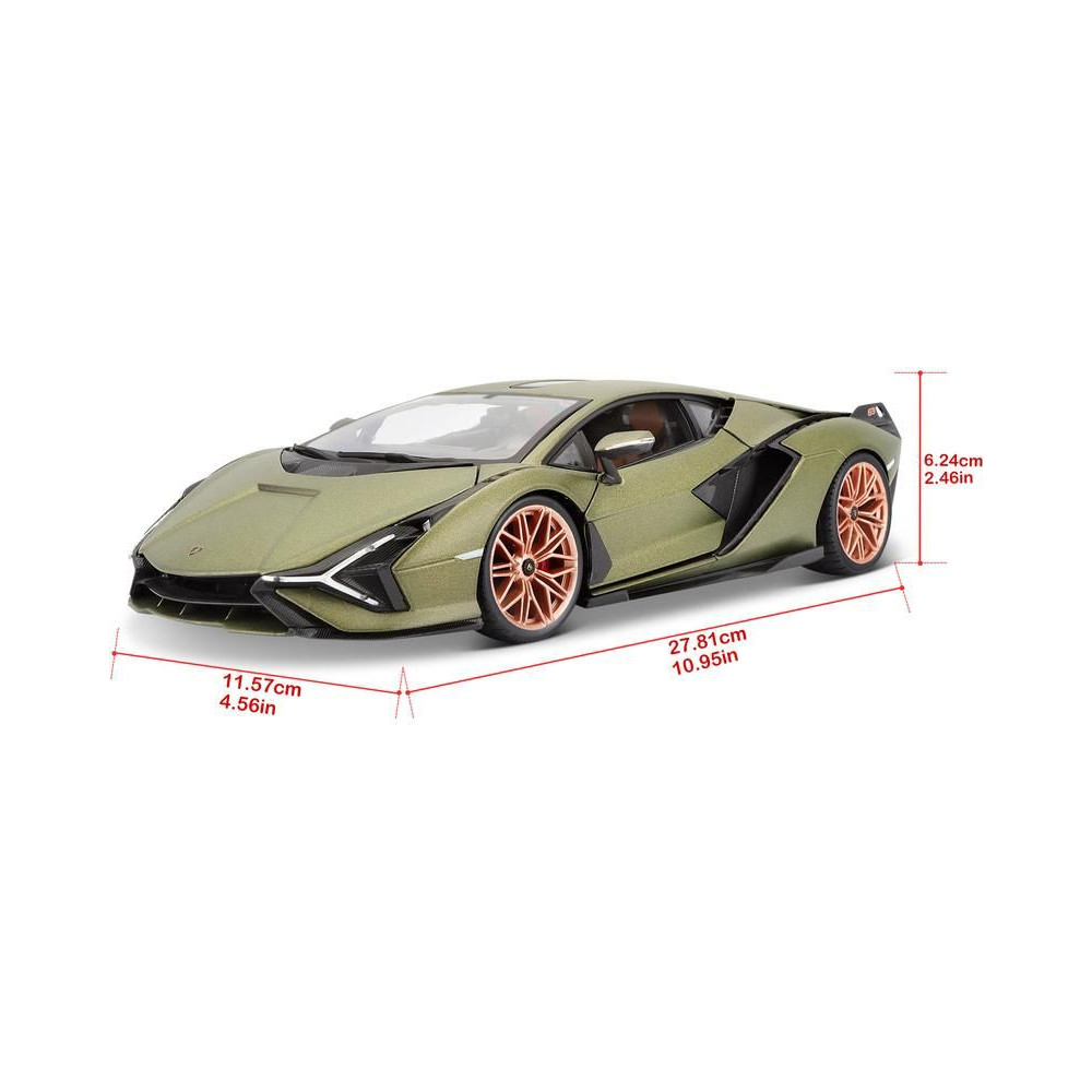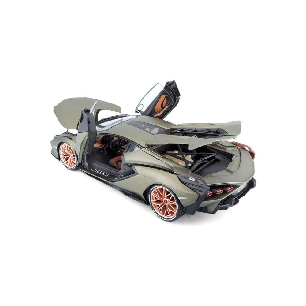 Fém autómodell 1:18 Bburago 18-11046 Lamborghini Sián FKP 37 nem csak gyűjtőknek. Nyitható ajtókkal és motorháztetővel rendelkezik, a kormánykerék teljesen működőképes. A modell színe metálzöld, mérete kb. 24 cm.