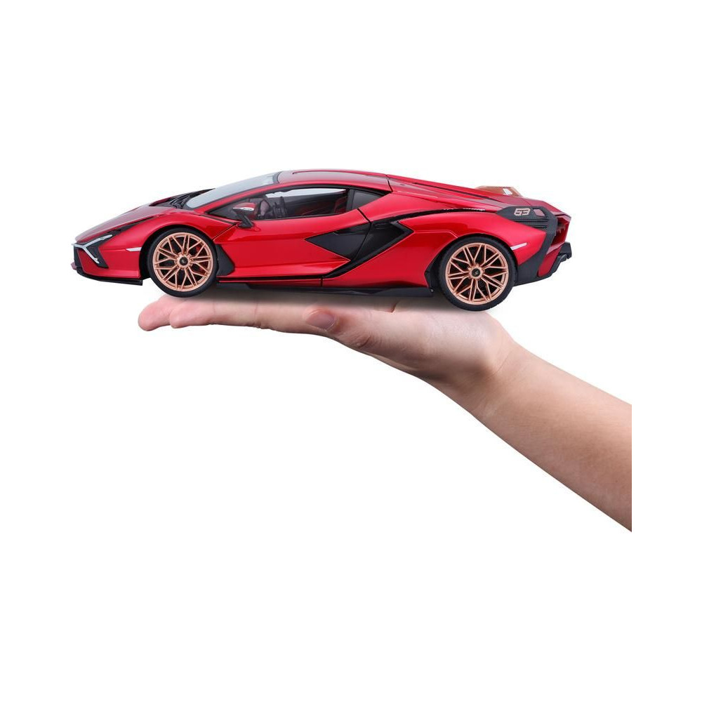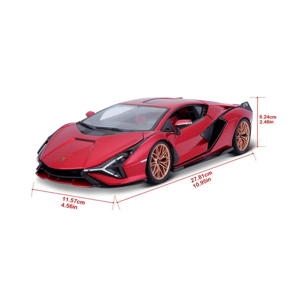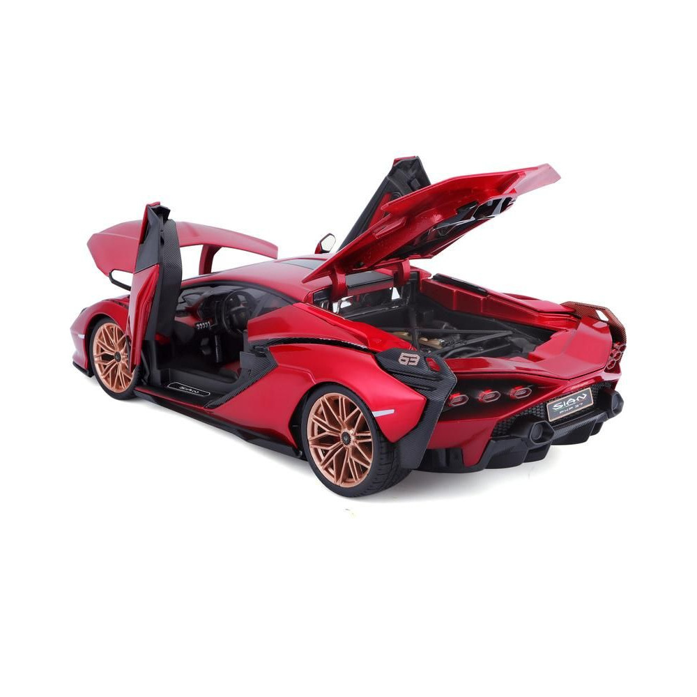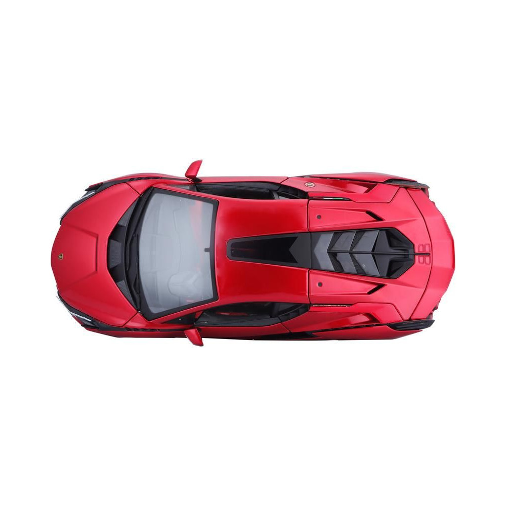 Fém autómodell 1:18 Bburago 18-11046 Lamborghini Sián FKP 37 nem csak gyűjtőknek. Nyitható ajtókkal és motorháztetővel rendelkezik, a kormánykerék teljesen működőképes. A modell színe piros, mérete kb. 24 cm.
